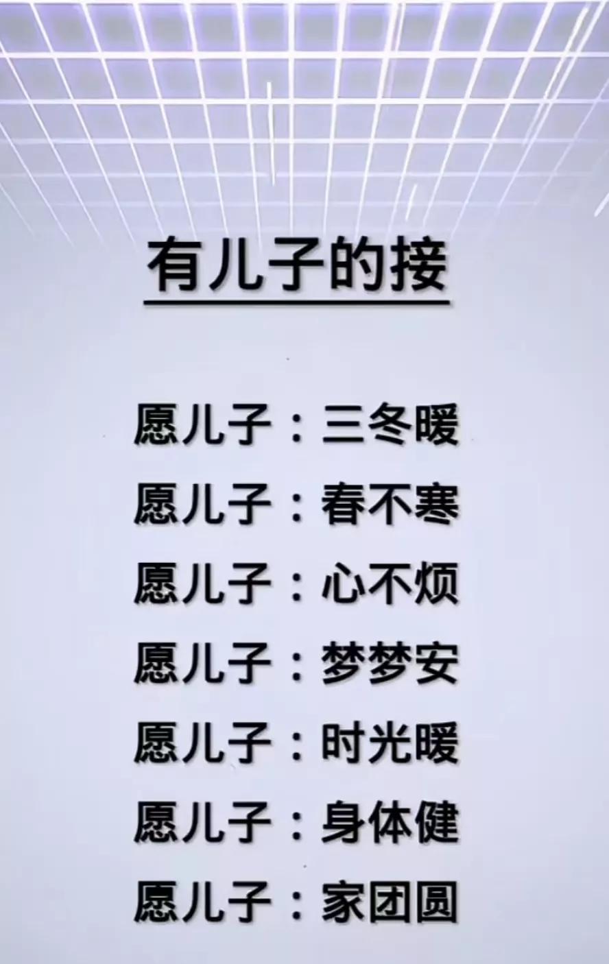 有儿子的接, 愿儿子:三冬暖 愿儿子:春不寒 愿儿子:心不烦 愿儿子:梦梦安 愿