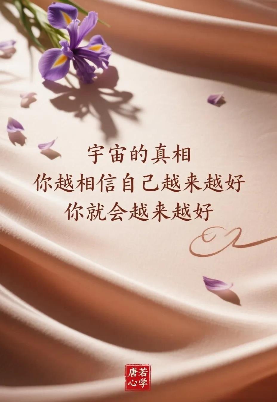 宇宙的真相是:你相信自己越来越好,你就会越来越好!相信,本身就是一种连接宇宙高维能量的强大力量。 如果没有坚定的、积极的、高频的信念,一切外在的努力都如同在沙滩上建塔,根基不稳,终会坍塌。你想要的人生境遇,并不只是靠拼命“做什么”,而是靠你内心深处“信什么”。 人性最大的误区就是向外求索,却忽略了内心这盏最亮的灯。谁要是带着深深的怀疑和恐惧去行动,最终,都会无一例外地把机会变成挑战,把顺境变成逆境,招来挫败与失望。 最后,把自己的能量拉低了,行动力削弱了,心力交瘁,陷入无尽的内耗。 不要轻易被外界的否定或暂时的困难动摇,守护好内心的那道光。 就如智者所言:境随心转,相由心生。