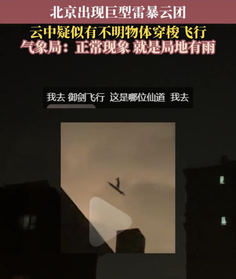 这下彻底解释不清楚了!北京,一网友晚上拍视频,本想拍一下闪电,结果却意外拍到“黑影御剑飞行穿越雷暴”,虽然气象专家解读是正常现象,但这画面怎么看,都和小说中的场景相似。网友:千万别让老外看到 从网友拍摄的视频来看,有一个不明黑影在空中移动,因黑影形象酷似武侠剧中站在剑上飞行的侠客,就像是小说和影视剧中的“御剑飞行”一样 对此,气象局的工作人员解释,说这是典型的夏季雷暴天气。雷暴发生时,云层会在放电过程中产生闪电,而云层本身也在移动。闪电亮起的一瞬间,有些较暗的云团或雨幕会被衬托出来,看起来就像有个黑影在空中漂移 其实,这只是视觉错觉,并不是天空中真有人在飞。只是过去没有拍短视频,所以没有被大家拍下来而已 从物理原理上看,雷暴云顶会带正电荷,云底带负电荷,两者之间的电位差产生闪电。闪电瞬间的强光照亮了云层不同位置的密度差和形态,恰好形成了我们看到的“黑影”。这个过程完全符合自然规律,但碰巧组合出一个极像影视场景的轮廓 类似现象在航空领域早有记录。飞行员们管这个叫"黑暗闪电",2014年NASA的观测卫星就捕捉到过雷暴云顶端向上喷射的黑色电离现象。不同的是,这次黑影的轮廓恰好符合人类对"御剑飞行"的集体想象,加上拍摄角度像是从地面仰视,才造就了这场美丽的误会 由此来看,很多“奇景”并不是超自然事件,而是自然规律和巧合叠加的结果。科学能解释原理,但不影响我们去欣赏它的趣味性。毕竟,人类的想象力很多时候就是被这种偶然的画面激发出来的