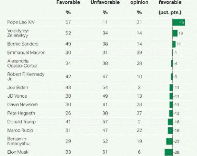 据《今日美国报》等美媒5日报道,盖洛普最新民调结果显示,在14位美国及国际的知名人物中,教皇利奥十四世在美国民众当中的受欢迎程度最高,马斯克和内塔尼亚胡排名垫底。 教皇利奥十四世净好感度(即持正面看法的受访者比例减去持负面看法的受访者比例)达+46%,位列第一;乌克兰总统泽连斯基净好感度+18%,排名第二;无党派参议员桑德斯净好感度+11%,排在第三。 相比之下,其他多名政界人物净好感度为负值,以色列总理内塔尼亚胡以及美国亿万富豪埃隆·马斯克位居排名末尾。 内塔尼亚胡在美国民众当中的好感度为29%,马斯克为33%,但后者的反感度高达61%,净好感度为-28%,导致排名倒数第一。特朗普本人的净好感度为-16%,排名倒数第四。