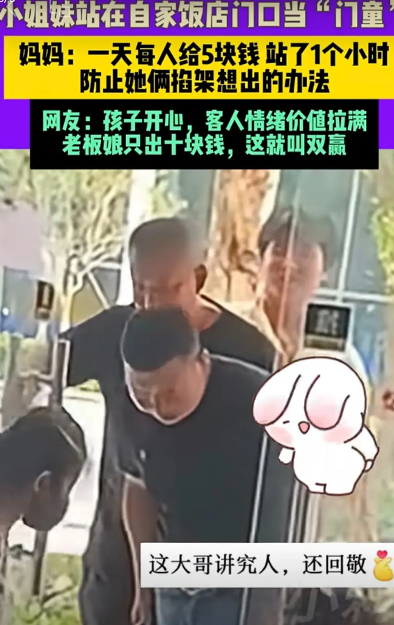 8月7日(发布)上海,小姐妹站在自家饭店门口当“门童”,妈妈:一天每人给5块钱,站了1个小时,防止她俩掐架想出的办法,网友:孩子开心,客人情绪价值拉满,老板娘只出十块钱,这就叫双赢。