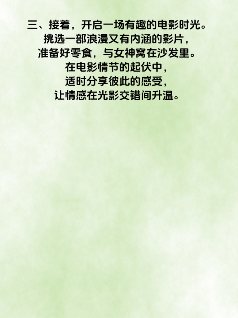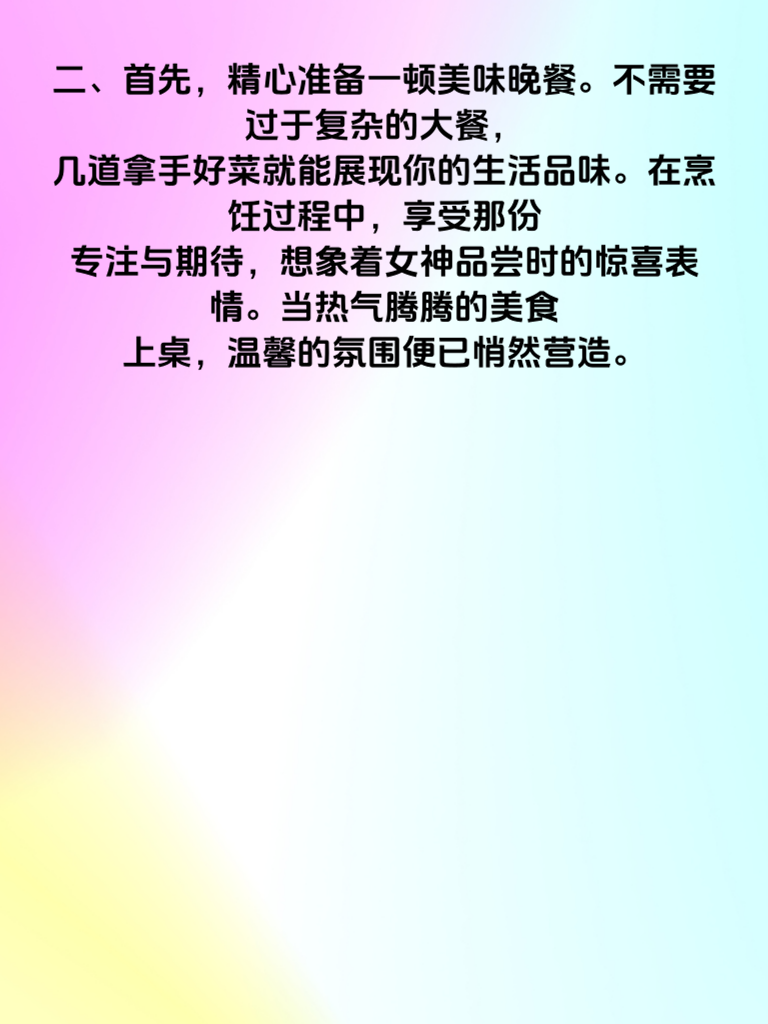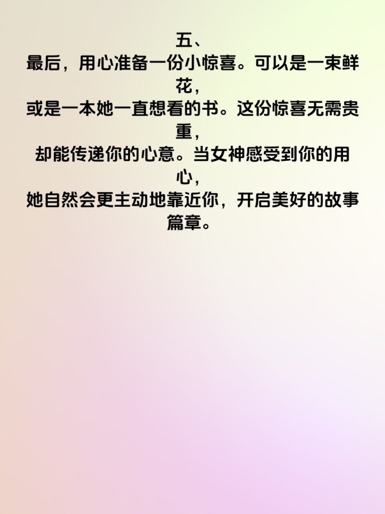 一、下班后的时光,是拉近与女神距离的黄金时段。想要让女神主动靠近,不妨试试这几件事。 二、首先,精心准备一顿美味晚餐。不需要过于复杂的大餐,几道拿手好菜就能展现你的生活品味。在烹饪过程中,享受那份专注与期待,想象着女神品尝时的惊喜表情。当热气腾腾的美食上桌,温馨的氛围便已悄然营造。 三、接着,开启一场有趣的电影时光。挑选一部浪漫又有内涵的影片,准备好零食,与女神窝在沙发里。在电影情节的起伏中,适时分享彼此的感受,让情感在光影交错间升温。 四、再者,一起进行一场轻松的运动。比如散步,在夜晚的微风中,畅谈生活、梦想与趣事。运动能激发活力,也为你们创造更多亲密交流的机会。 五、最后,用心准备一份小惊喜。可以是一束鲜花,或是一本她一直想看的书。这份惊喜无需贵重,却能传递你的心意。当女神感受到你的用心,她自然会更主动地靠近你,开启美好的故事篇章。