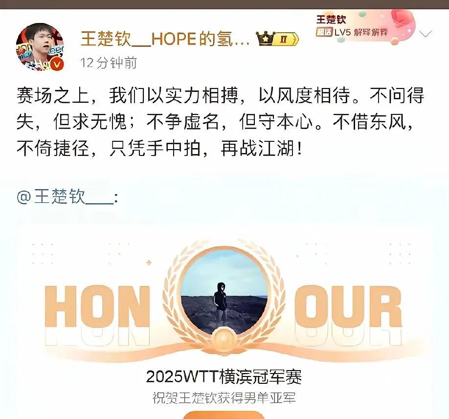 少拿输给日本人丢人说事儿!横滨冠军赛王楚钦没打过张本智和拿了亚军,输了就是输了,技不如人就认栽,哪有那么多狭隘的情绪,何况大头对战张本14战12胜,8连胜压制,上个月4-0横扫张本还不够长脸吗? 竞技体育哪有那么多赢家,哪有什么永远的赢家,今天的亚军未必不是明天更强的沉淀,用国籍给胜负贴标签,这才是真丢人,大家觉得呢?