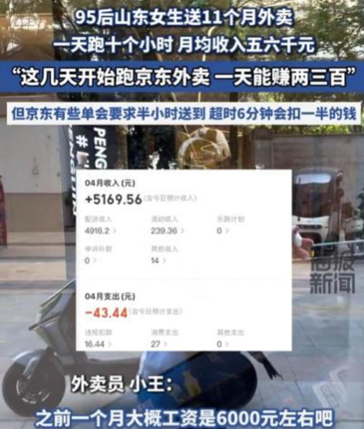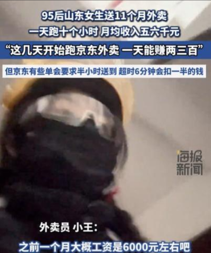 这女生够真实!山东,95后女生送外卖,听说京东补贴大,果断开始跑京东,结果,送了几天后,她发现和之前相比,并没有太大提升,女生已经送了11个月外卖,平均一天10小时,收入五六千的样子!现在跑京东外卖,她坦言:一天能赚两三百,算下来六千左右,要多一些,但不大!