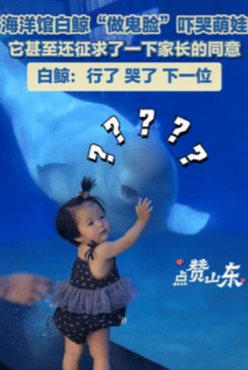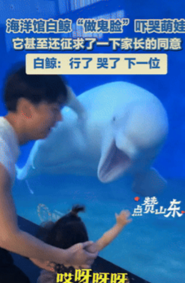 这是成精了?山东德州,一家三口去海洋馆看白鲸,出于好奇,孩子目不转睛的看着白鲸,没想到,白鲸扫视了一下孩子后,竟玩心大起,突然“做鬼脸”去吓唬她。不料,家长看到孩子哭了后,却还开心的哈哈大笑,网友:第一次看见白鲸和人类表情如此一致! 据闪电新闻8月12日的报道,趁着有时间,这对父母便带着孩子到海洋馆里玩一下,让孩子见识下外面的新鲜事物。 而在馆里游玩的时候,小朋友瞬间被白鲸给吸引住了,便站在外面目不转睛的看着白鲸在水中畅游。 不过当白鲸见到小家伙后,便玩心大起,准备吓唬一下她,当然了,这一举动也得到了家长 的默许。 只见它向家长看了一眼,像是在表达能不能吓的意思,在得到准许之后,就准备开始动手了。 可就在这个时候,小朋友却突然把头给扭开后,旁边的家长就及时出手提醒,让她把头给转过去。 就这样,当他俩对视的一瞬间,白鲸突然就张开了大口,一下就把小朋友给吓得不轻,本能的哆嗦了一下,接着就开始哭了。 然而,家长却对此喜闻乐见,甚至还很开心的呲牙大笑,同时也把小朋友抱在怀里,安慰一下她“受伤”的小心灵。 以前总能听说像白鲸、虎鲸等,智力都不俗,都能和6、7岁小孩的智商想比,如今算是体会到了。 那么对于这件事情,您有什么想说的呢?