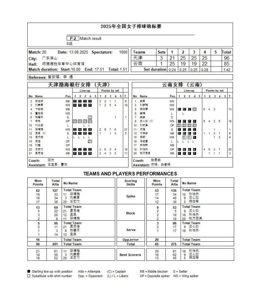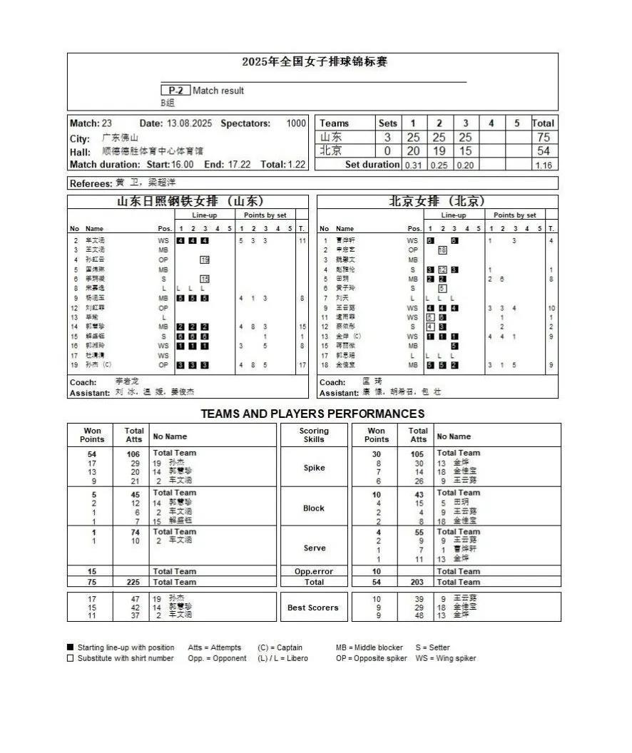 【女排全锦赛B组第四日赛果及排名更新】 山东女排展现强劲实力,3-0横扫北京(25-20、25-19、25-15)。孙杰状态火热拿下17分(29扣17中),郭慧珍贡献15分(20扣13中+2拦),车文涵11分入账;北京队王云蕗10分、金烨与金佳宝各得9分。技术统计上,山东扣球54-30领先,自失控制更优(10-15)。 天津女排3-1逆转云南(21-25、25-19、25-19、25-22)。陈博雅砍下21分(33扣19中+2拦),刘美君、王艺竹同获18分,夏思佳11分(含5拦)。天津扣球62-53占优,拦网13-9领先。 B组即时排名: 这样的调整更突出比赛焦点,数据呈现也更清晰,你觉得如何?