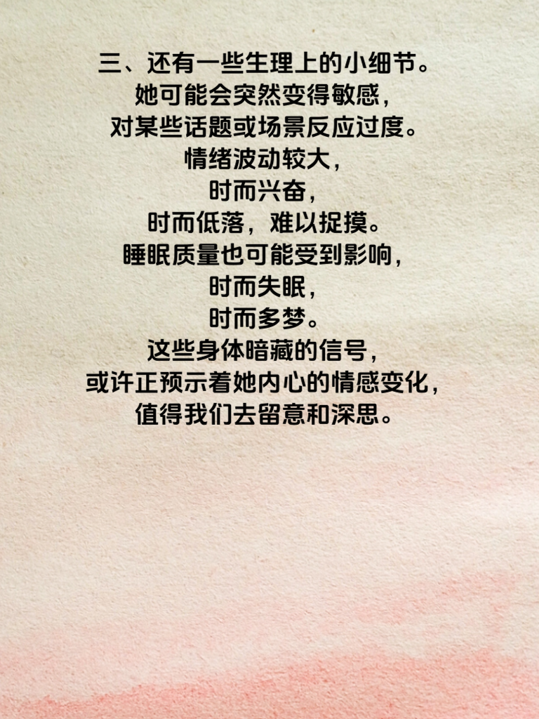 一、中年女性出轨前,身体或许会出现一些微妙信号。比如,她开始格外注重自己的外表,频繁购买新衣服、更换发型,仿佛想要重新找回青春的魅力。这可能是因为她渴望在他人眼中展现出不一样的自己,为潜在的新感情做铺垫。 二、身体语言也会有所变化。她可能变得更加热情主动,与你相处时肢体接触增多,眼神中也多了几分躲闪与神秘。原本规律的生活作息或许会被打乱,开始有更多独自外出的时间,且对行踪的解释变得含糊不清。 三、还有一些生理上的小细节。她可能会突然变得敏感,对某些话题或场景反应过度。情绪波动较大,时而兴奋,时而低落,难以捉摸。睡眠质量也可能受到影响,时而失眠,时而多梦。这些身体暗藏的信号,或许正预示着她内心的情感变化,值得我们去留意和深思。