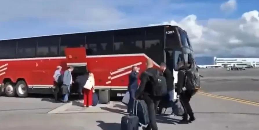 俄记者落地美国后,直接拉走。 俄罗斯记者们已经先抵达阿拉斯加参加美俄峰会。大巴车直接开到飞机旋梯,飞机已落地,下来的人直接就拉走了。 因为这里是军用机场哦。