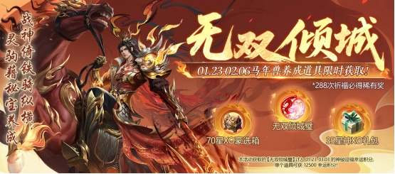 紧随吕布之后,“风华映岁,倾城登场”的绝世佳人——“闭月倾城·貂蝉”也已经于1月28日正式与大家见面。貂蝉的获取活动名为“闭月倾城·貂蝉”,持续至2月11日23:59。与吕布的获取方式类似,神选者需使用“倾城玉佩”或“闭月仙珠”参与祈福,便有几率将这位集控制与辅助于一身的法系主宠带回家。奖池中同样包含了“[年兽]貂蝉尊享传承包”、70星XO臻选箱以及相性+15精品箱等厚礼。每日登录同样有免费的“闭月倾城成就箱”相送,且累计获得至臻奖励同样可以解锁高星XO兑换函以及专属的“头像框·倾城之姿”。这两位主宠不仅具备人形态和马形态的双重外观,更拥有双养成线和无需出征即可提升攻击力的强大被动,绝对是2026年不容错过的最强幻兽。