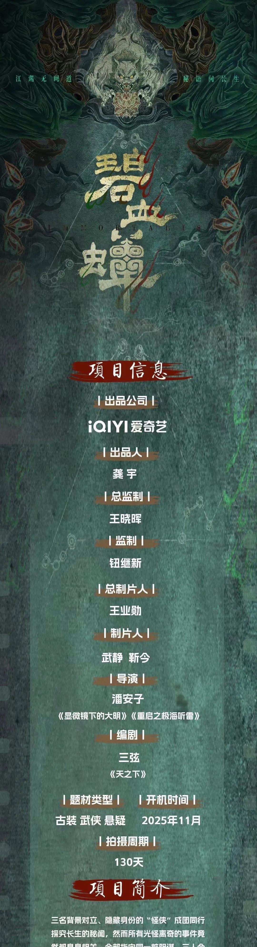 《碧血蝉》来袭!潘安子执导+三弦编剧,爱奇艺重磅打造!改编自豆瓣同名小说,11月开机,拍摄130天。三名身份成谜的“怪侠”组队探长生秘闻,离奇事件背后藏惊天阴谋,他们能否破局改命?