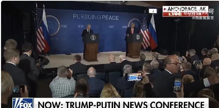 Trump - Putin联合新闻发布会,已经开始,两国总统走上台与媒体见面。 配图显示发布会现场情况