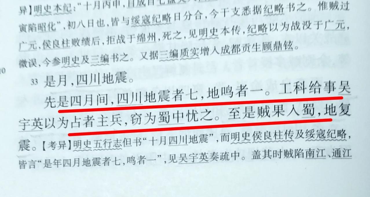 《明通鉴》载,崇祯十年四月四川发生七次地震、一次地鸣。占卜者卜之,乃刀兵之兆。数月后,李自成果然率军入蜀,兵祸大起。