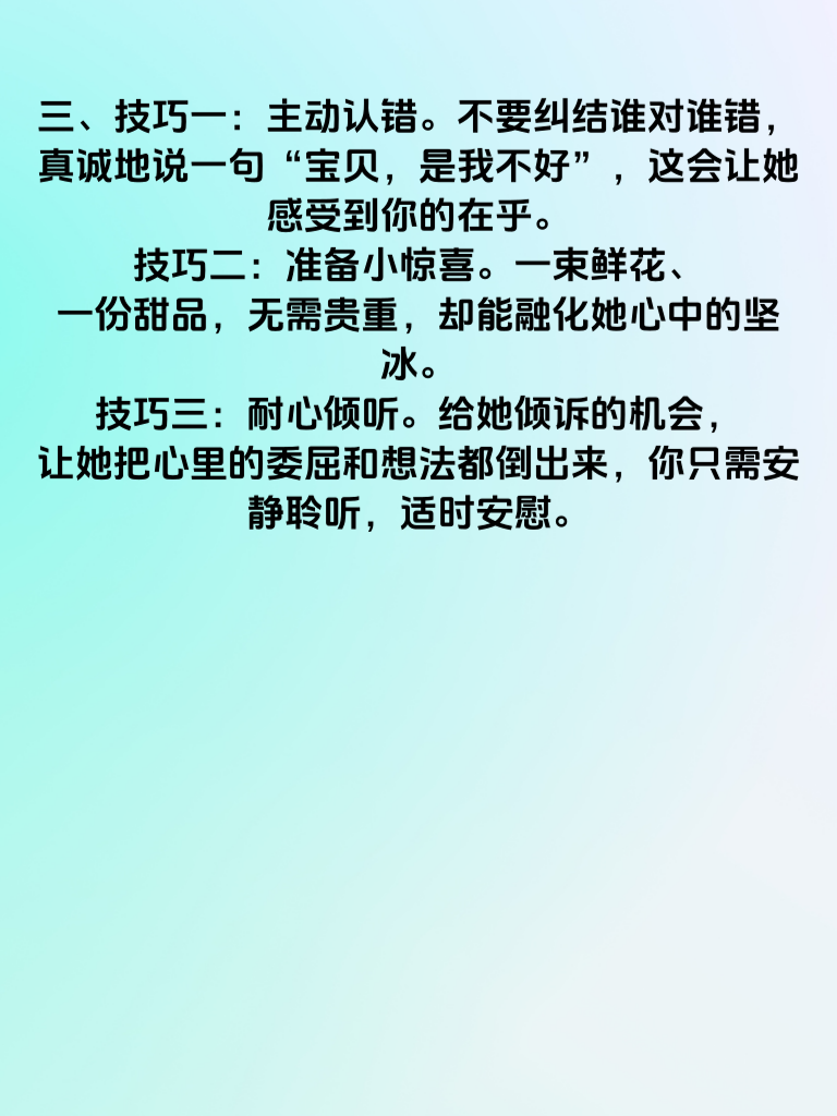 一、冷战,是婚姻中的暗礁,一不小心就会让感情触礁。在婚姻里,冷战看似无声,却比争吵更具杀伤力。每一次冷战,都像是在两人之间筑起一道冰墙,让温暖难以传递。 二、想要修复冷战后的婚姻,首先要明白女性心理。很多时候,女生冷战并非无理取闹,而是渴望被重视、被理解。她们期待男生能主动打破僵局,真诚沟通。 三、技巧一:主动认错。不要纠结谁对谁错,真诚地说一句“宝贝,是我不好”,这会让她感受到你的在乎。技巧二:准备小惊喜。一束鲜花、一份甜品,无需贵重,却能融化她心中的坚冰。技巧三:耐心倾听。给她倾诉的机会,让她把心里的委屈和想法都倒出来,你只需安静聆听,适时安慰。 四、婚姻不易,冷战后的修复需要小心呵护。用爱和耐心去化解矛盾,用心去经营,才能让婚姻这艘船在爱的海洋里继续平稳航行,驶向幸福的彼岸。