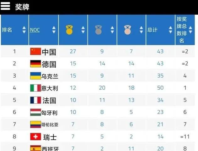 2025成都世运会结束,最终成都金牌榜前十如下,稍后奖牌榜整理下 第一中国31金,最后一天收获4金 领先第二名14金 第二德国17金最后一天收获两金守住第二 第三乌克兰15金,最后一波没金牌进账 第四意大利13 金,收获一金最后一天 第五法国11金,最后一天收获一金 第六匈牙利11金,最后一天收获了一金 第七美国9金,最后一天收获三金,前进三位 第八,第九,第十都是7金,依次是日本,哥伦比亚,瑞士,其中日本是最后一天两金后来居上第八 #成都世运动会# #成都世运会# 成都好地方,举办大运会,世运会我们都是第一,期待未来举办亚运会,奥运会#成都世大运动会#