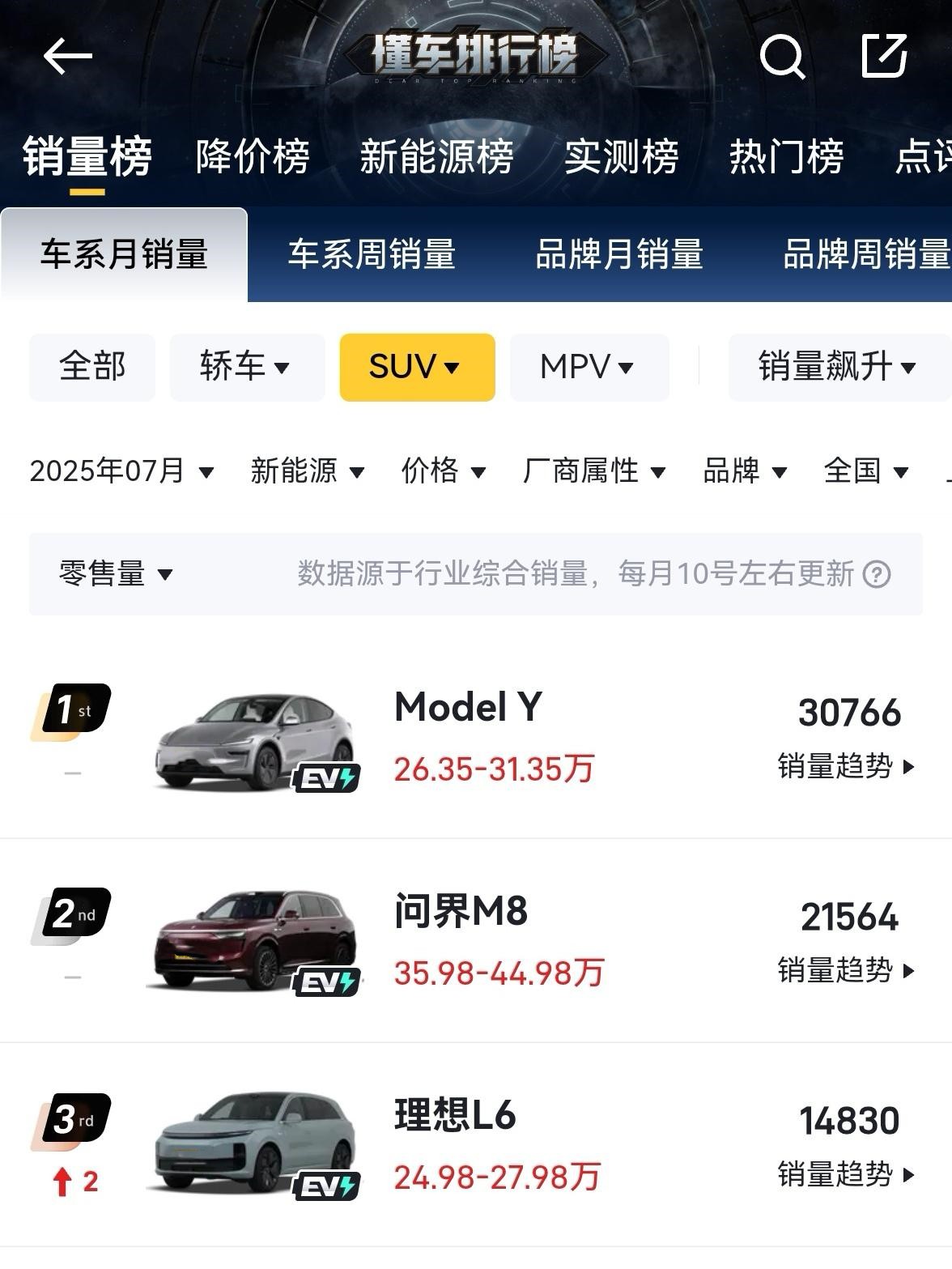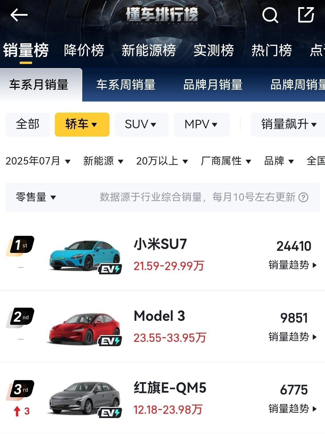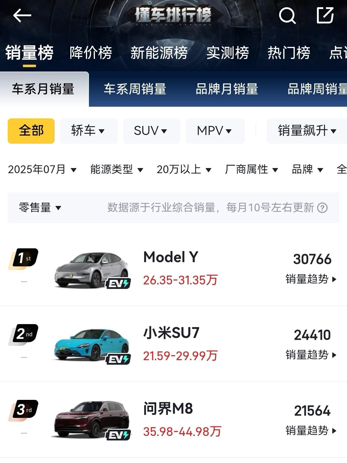 七月销量榜放榜,我们来从销量榜看一看车市变化,分析一下新能源车的销量排名,看看行业发展动态。 ●20w以上新能源车销量前三甲,分别是Model Y(30766),小米SU7(24460),问界M8(21564),modelY目前看地位还是难以撼动,小米su7受积压订单和产能限制,产量也已经达到饱和,问界M8是个惊喜,上市一个月就能挤进前三,说明华为的技术在国内还是受到消费者信赖的。 ●新能源轿车领域,小米su7依旧领先Model 3,说明小米su7的产品力和性价比很高,也证明su7的产品力已经得到广大消费者的信赖了。反观特斯拉除了三电和操控已经全面落后了。特斯拉已经感受到压力了,最近频繁发布新款型来抢占市场份额。 ●在SUV领域,问界M8从实际名义上已经超越特斯拉了,毕竟售价达到了30w接近40w,能有这个销量已经是个奇迹了,小米YU7虽然没挤进三甲,但是随着产能的不断提升,销量起来不在话下。理想慢慢的在这个领域掉队,再加上最近风评事件影响,理想必须思变了,竞品都在进步,理想还在原地踏步就属于不进则退了,我给的建议是通过降价来抢回市场份额。 ◢从7月20w以上新能源汽车销量榜可以看出,以华为和小米为代表的国产品牌已经对特斯拉形成围剿之势,产品力差距逐渐缩小,有些地方已经超越,用不了多久就能全面超越特斯拉。
