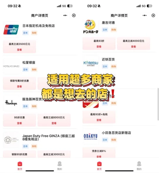 ✅悄悄告诉你:优计划上还有超多商户优惠活动,逛吃都能省~优计划小🍊序首页下滑就能找到超多商户优惠!像是在唐吉诃德指定店铺,使用银联卡,可以享受最高93折优惠;高岛屋百货在优计划上报名后,用银联卡单笔消费满3万日元随机立减最高立减2000日元!