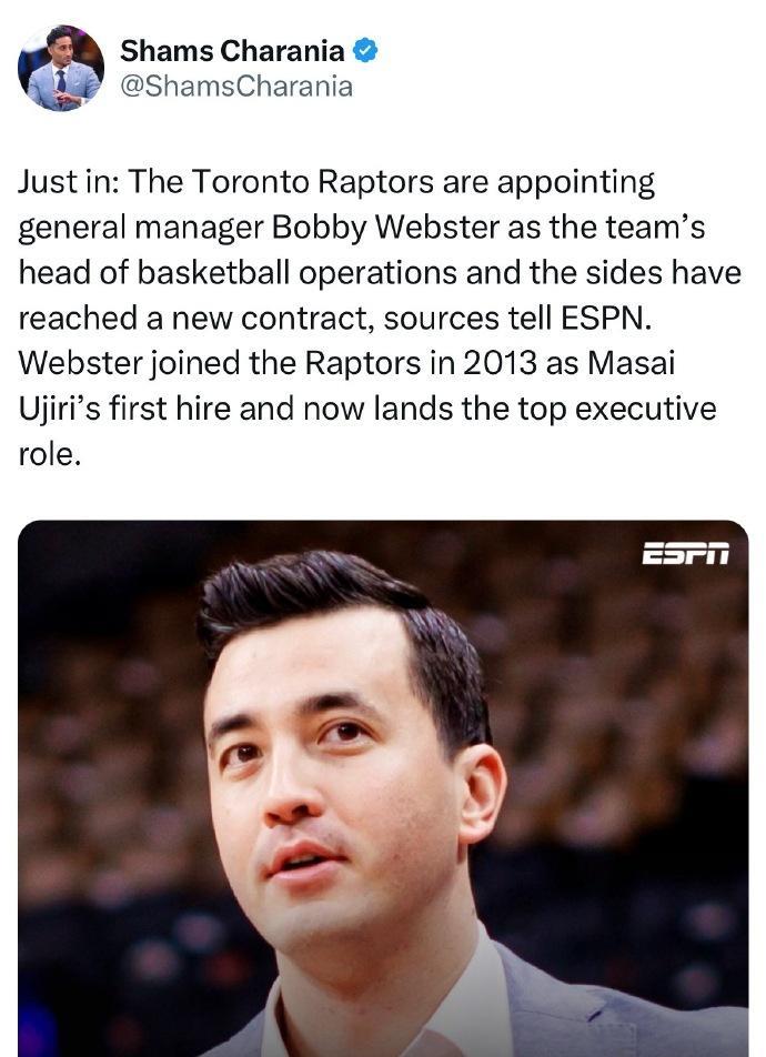 Shams: 猛龙队将任命总经理鲍比·韦伯斯特为球队篮球运营总裁,双方已达成一份新合同。 韦伯斯特于2013年加入猛龙队,是乌杰里上任后聘请的首位员工,如今他将担任球队最高管理职位。