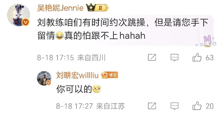 刘畊宏邓超搭档打篮球,吴艳妮拉拉队! 8月18日,刘畊宏在社交平台晒出了参与姚基金邀请的篮球赛的现场照片。真是众星云集,姚明、莫布利、凯尔·库兹马、邓超、吴艳妮等一起参与了活动。 吴艳妮在评论区留言:“刘教练咱们有时间约次跳操,但是请您手下留情[笑哭]真的怕跟不上hahah[/cp]”… 刘畊宏回复: 你可以的[不愧是你][/cp] 哈哈哈,有点期待两人一起跳操的画面。