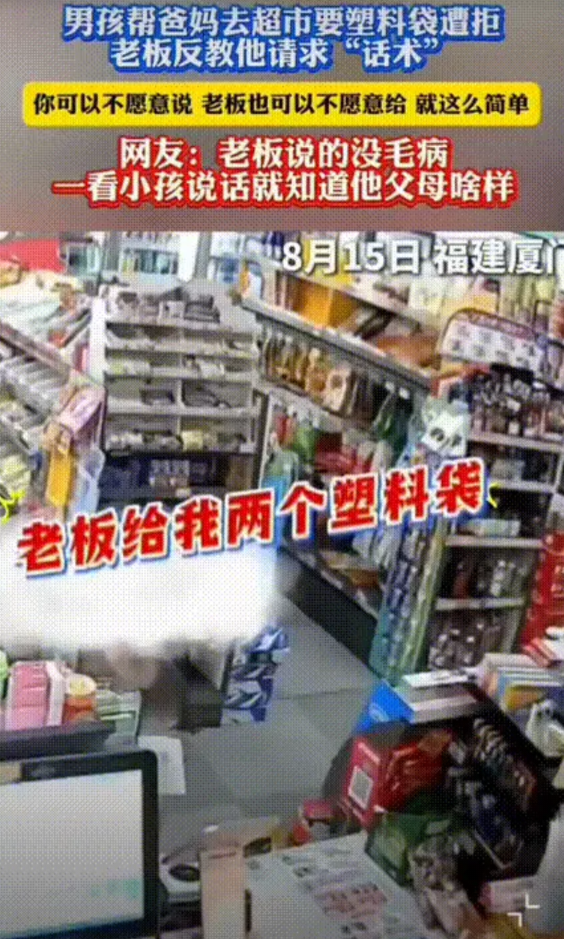 一看小孩说话就知道父母啥样!福建厦门,一小男孩到超市,咄咄逼人的跟老板来个句:“老板给我两个方便袋,我爸妈要用!”老板听着男孩强硬的语气问了句:“你爸爸妈妈就是这么教你说的吗?” 8月,福建厦门一家超市里发生的事儿,在网上吵得挺凶。 说起来也简单,就是个小娃娃去要塑料袋,结果没拿到,还引来了一堆讨论。 那天晚上八点多,超市里进来个四五岁的小男孩,直奔柜台咄咄逼人的说,几要两个塑料袋,说是爸妈要用。 老板没直接给,反问他为啥要给,还让说个理由。 孩子哪见过这阵仗,支支吾吾说不上来,老板又教他该怎么说,得带个“请”字,客气点。 可孩子就是不肯照做,最后气呼呼跑出去,跟店外的爸妈喊,说老板不给袋子。 后来才知道,孩子爸妈一直就在外面等着,从头到尾没进来过。 孩子跑出去的时候,说话都带着颤音,明显是委屈坏了,可爸妈就站在那儿,啥也没说,也没进去问问情况。 这段监控被发上网,立马就炸了锅。 有人觉得老板做得对,现在的小孩就是缺礼貌,连个“请”字都不会说,老板这是在帮着教孩子。 也有人觉得老板太较真,不就是个塑料袋吗,跟个小孩较什么劲,还让人家编理由,这不是为难人吗? 再说说这孩子,看着也就四五岁的样子,估计平时爸妈没教过怎么跟外人打交道。 老板让他客气点说话,他可能都没明白啥意思,就知道爸妈让他来拿袋子,拿不到就着急。 换个角度想,这么小的孩子,敢自己进超市跟陌生人开口,其实也不算太差,就是缺了点方法。 至于孩子爸妈,这事儿里争议最大。 有人说,哪有让这么小的孩子单独去借东西,还不教怎么说的? 孩子在里面被问住了,做父母的就该进去帮一把,顺便教教孩子该怎么说。 可他们就那么站在外面,跟看戏似的,确实说不过去。 平时在家里可能觉得孩子还小,啥也不用教,真到了外面,才发现孩子连句客气话都不会说。 老板这边心思可能是好的,想让孩子懂点规矩。 但方式确实有点硬,上来就问“我为什么要给你”,还让孩子编理由,换谁都得懵。 要是先夸夸孩子,说“你能帮爸妈做事,真厉害”,再慢慢教他该怎么说,效果估计会好很多。 毕竟是对个小孩,太严肃了容易吓着人家。 网上吵来吵去,其实都绕着一个事儿:这礼貌到底该谁教,又该怎么教。 有人说,家里肯定是第一站,父母得手把手教,平时借个酱油、买个东西,就让孩子自己去,边做边教。 也有人说,社会上遇到了,旁人提点一下也没毛病,但得注意方式,不能让人觉得是故意刁难。 说起来,这事儿真不算多大,却能看出不少问题。 现在好多家长,要么觉得孩子还小,学这些太早,要么就是嫌麻烦,自己啥都包办了,忘了孩子早晚得自己面对这些。 结果孩子到了外面,稍微遇到点不顺,就不知道该怎么办了。 老板那番教导,要是换个柔和点的方式,说不定真能让孩子记住。 比如孩子说完要袋子,老板笑着说“可以啊,不过下次你要是说‘叔叔,请给我两个袋子好吗’,叔叔会更乐意帮你的”,这样孩子既拿到了袋子,又学了东西,多好。 至于那些网上骂孩子的,就有点过了。 再怎么说也就是个几岁的小孩,犯不着上纲上线,说什么“以后没出息”。 谁不是从小孩子过来的,犯了错,教了改了就行,没必要把人一棍子打死。 说到底,这事儿就是个提醒。 做父母的,别总觉得孩子小,该教的规矩得早点教,该放手让孩子自己做的,也别总护着。 遇到事儿了,别光站在一边看,上去帮一把,教几句,比啥都强。 做旁人的,看到孩子有做得不对的地方,要是想提点,也尽量温和点,别让好心办了坏事。 社会就像个大课堂,谁都可能遇到这样那样的事儿。 多一点耐心,多一点方法,不管是教的人还是学的人,才能都有收获。 这塑料袋虽小,可里面装着的,是做人的道理,是该怎么跟人打交道的学问,真不是一句“给”或者“不给”就能说清的。
