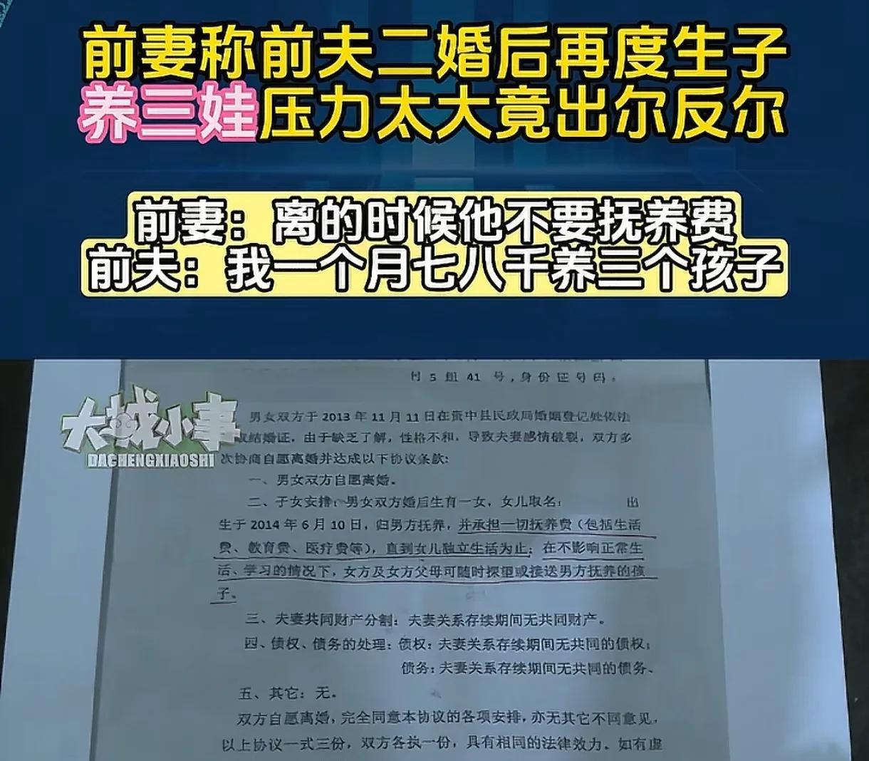重庆,男子离婚后,跟前妻约定,女儿归他抚养,前妻不用出任何费用,可之后男子再婚,娶二婚带孩子的女子为妻,跟妻子又生了一个孩子,生活压力大,他要求前妻支付孩子的抚养费。可前妻却说:这一切不是我造成的,我们是签了协议的,我不会给抚养费,就算要给,也不是2、3万的给,你得把凭证拿出来。 据重庆城市TV大城小事8月17日报道,易女士和前夫罗先生于2019年离婚,双方约定女儿归罗先生抚养,易女士无需支付抚养费。 可没想到,2024年,罗先生再婚后,却突然联系易女士,要求她支付女儿的抚养费。 罗先生说自己再婚后,二婚妻子带过来一个孩子,跟他们一起生活,两人又共同生育了一个孩子,加上自己和前妻生的女儿,自己一下子要养3个孩子。 家里就他一个人挣钱养家,一个月也就七八千块钱的工资,生活压力大,罗先生这才找到前妻索要抚养费的。 易女士气坏了,她认为当初是前夫自己提出来的,不要抚养费,并且前夫自愿签的离婚协议,上面白纸黑字写的清清楚楚,自己不用支付抚养费。 前夫出尔反尔就算了,可前夫竟然还阻止女儿跟自己联系。 为了解决这个问题,易女士找来了调解员,希望能和前夫好好协商。 在调解现场,罗先生跟调解员说,自己要养3个孩子,生活压力大,当初签协议的时候,觉得自己一个人带孩子没问题,能负担起,可没想到现在却是这种情况。 易女士却毫不留情地指责对方:明明当初承认说不给的,你凭什么现在又找我要。 易女士的姐姐更是气愤难平:作为一个男人,既然你签了这个字,选择了这条路,那就得走完,又没有人威胁强迫你,这都是你自愿的。 罗先生无奈解释,当时确实没考虑那么多,现在情况变了,希望前妻能理解自己的难处。 易女士却认为前夫现在的处境并不是自己造成的,双方既然已经签了协议,就应该按照协议来执行。 并且对于罗先生主张的,他给女儿交了17000元的培训费,这让易女士很难接受。 易女士姐姐直言:作为孩子的母亲,适当考虑给孩子一些抚养费用也不是不可以,但是你要报个 2 万、3 万的,就叫我们给,这谁能相信啊?口说无凭,你得拿出转账凭证,凭票说话。 罗先生则认为,自己报了名后,把票开回来,大家可以商量着来,不能只考虑对自己有利的方面。 易女士还提到,女儿曾跟她说过,后妈要找她要1500元抚养费,易女士说自己没上班,给不了那么多,女儿说后妈让她给500每月,可现在她根本联系不到女儿,无法求证女儿所说的话是否属实。 2025年2月,她给女儿买了一个电话手表,寄到前夫家里,想着方便自己和女儿联系。 可没想到,电话手表拿过去没两三天,就打不通电话了,前夫把自己的所有联系方式都给拉黑了。 罗先生却有自己的理由,他说之所以不让女儿跟前妻联系,是因为前妻在跟孩子聊天时,总是乱教。 他气愤地说:“她跟女儿说‘你爸爸不是人,你爸爸是窝 囊废,现在的妈妈怎么样这类的’。” 易女士则反驳说自己只是在教女儿要诚信为本,不能像她爸爸和后妈一样出尔反尔。 易女士姐妹认为要么就按照离婚协议来执行,自己正当行使探视权,要么就变更孩子的抚养费。 罗先生表示可以问女儿的意见,如果女儿愿意跟着前妻,自己可以每个月拿1000元抚养费给前妻;反之,前妻也应该按照这个比例支付抚养费。 易女士姐妹却坚持认为只能按照离婚协议办事,当初是罗先生自己不愿意要抚养费的,现在没理由找自己要。 罗先生见协商无果,气愤地说既然这样,那自己就去起诉。 后来,调解员问过易女士女儿意见,女儿表示愿意跟着爸爸一起生活。 听女儿这么说,易女士表示孩子可以跟着她爸爸,只要自己能联系上她就行。 罗先生也做出了妥协,表示前妻支付每个月400元补习费就可以了。 1、离婚时约定不支付抚养费,事后还可以要求支付抚养费吗? 《民法典》第1085条规定:离婚后,子女由一方直接抚养的,另一方应当负担部分或者全部抚养费。 离婚协议是双方自愿签订的,具有法律效力,但在特定情况下,如一方生活发生重大困难、子女实际需求发生变化等,协议内容是可以变更的。 罗先生再婚后,家庭经济状况发生重大变化,如女儿因上学等实际需要,他有权以子女的名义向易女士提出增加抚养费的请求,但需要提供充分的证据证明经济状况的变化以及子女实际需求的增加。 2、易女士有探望子女的权利,罗先生不应阻止女儿和易女士联系。 《民法典》第1086条规定:离婚后,不直接抚养子女的父或者母,有探望子女的权利,另一方有协助的义务。 离婚后父母与子女的关系不会因婚姻关系解除而改变,父母仍需履行抚养、教育、保护子女的义务,包括支付抚养费和协助对方行使探视权等。 罗先生见拿不到抚养费,就阻止女儿和易女士联系,这种做法是不合适的。 关注@律觀法说 ,从法律角度看世界,感受不一样的人情冷暖。