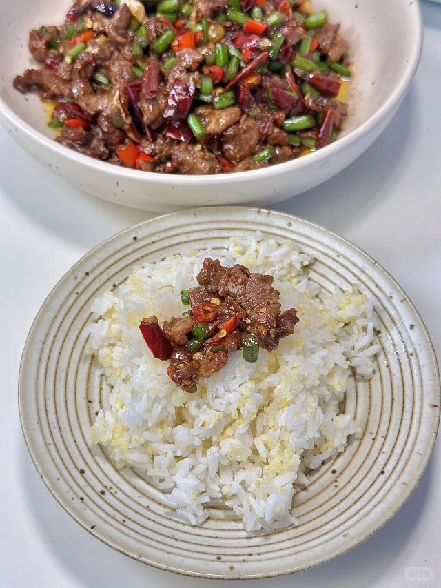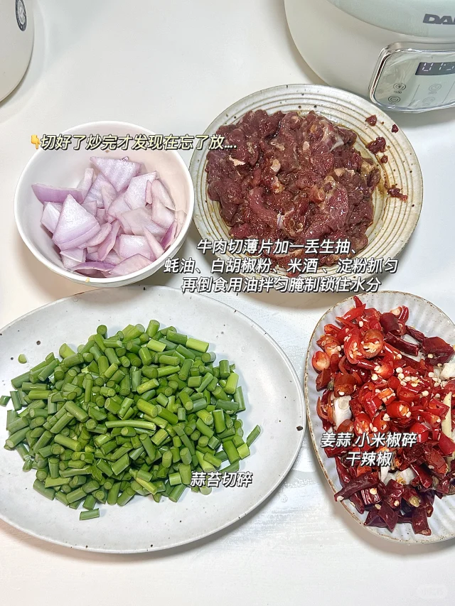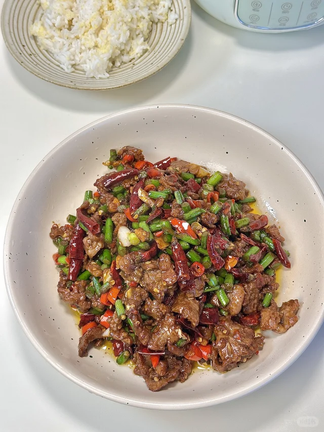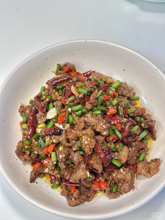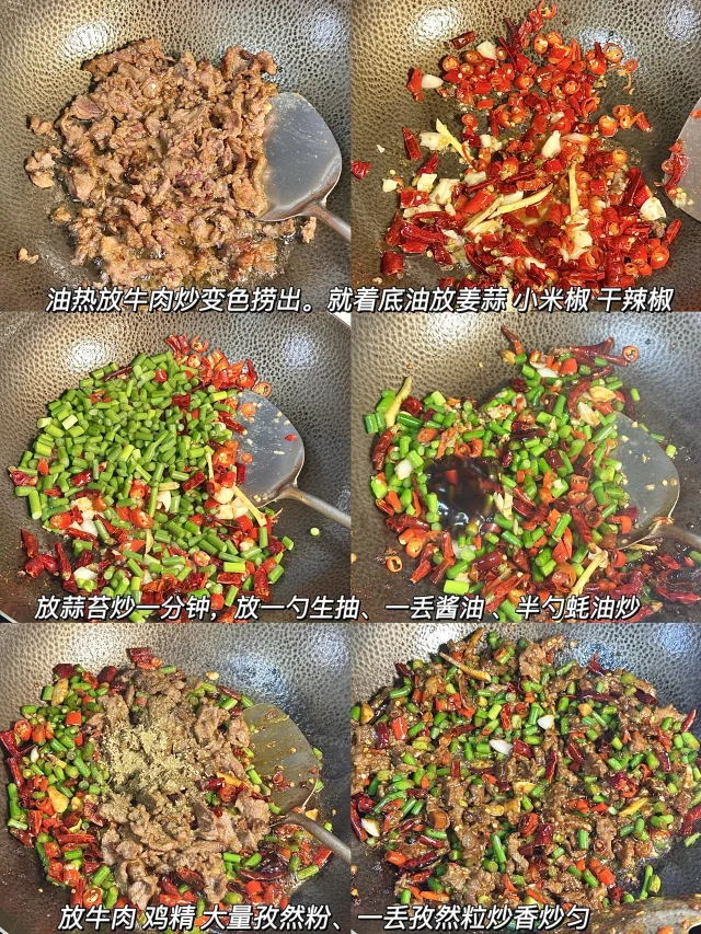 孜然牛肉 加了切碎的蒜苔口感丰富,拌米饭一吃一个不吱声[哇R]一定要试试!🍚炫不停~你们家里有洋葱可以切点(洋葱🧅我切好忘了)牛肉回锅的时候洋葱一起倒进去~夏日消暑风味集 ✨食材:牛肉 蒜苔 姜蒜 小米椒 干辣椒 1️⃣:锅里倒油烧热放腌制好的牛肉变色盛出,再放姜蒜 小米椒 干辣椒炒香,再倒入蒜苔炒一分钟,调味加生抽 酱油 蚝油炒香炒断生。放牛肉(切了洋葱的话一起放进去)加鸡精 孜然粉、孜然粒炒匀炒香。 好好吃饭呀🖖🏻