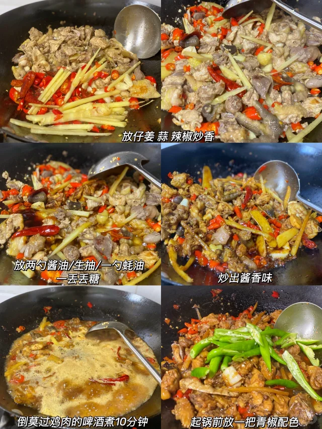 3⃣️:转小火放两勺酱油/生抽/一勺蚝油/一丢丢糖 大火炒出酱香味,倒入盖过鸡肉的啤酒🍻,煮开后盖盖转中小火煮10分钟。起锅前一把青椒配色,记得留点汤汁哦