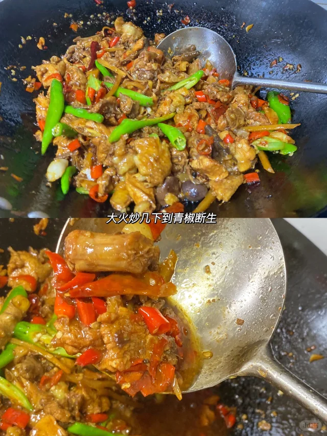 2⃣️:锅里倒油 放姜片 花椒炒几下,再倒入鸡肉翻炒至微微变色,放一点十三香 沿着锅边倒一勺料酒。全程大概炒个六分钟,炒干水份,到油清澈的状态。然后放仔姜辣椒 蒜粒炒均匀。