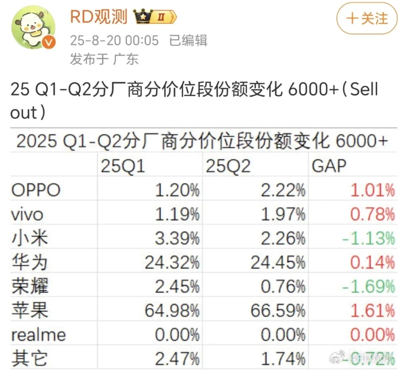 你以为只是1%的变化,实际上是30%,100%的变化。对于小米,OV,荣耀这三家来说,市场份额减少一个百分点就是暴跌,增加一个百分点就是暴涨了。 这Q2季度里面各家都在降价的节点下,之前定价越高的厂商越占据优势。