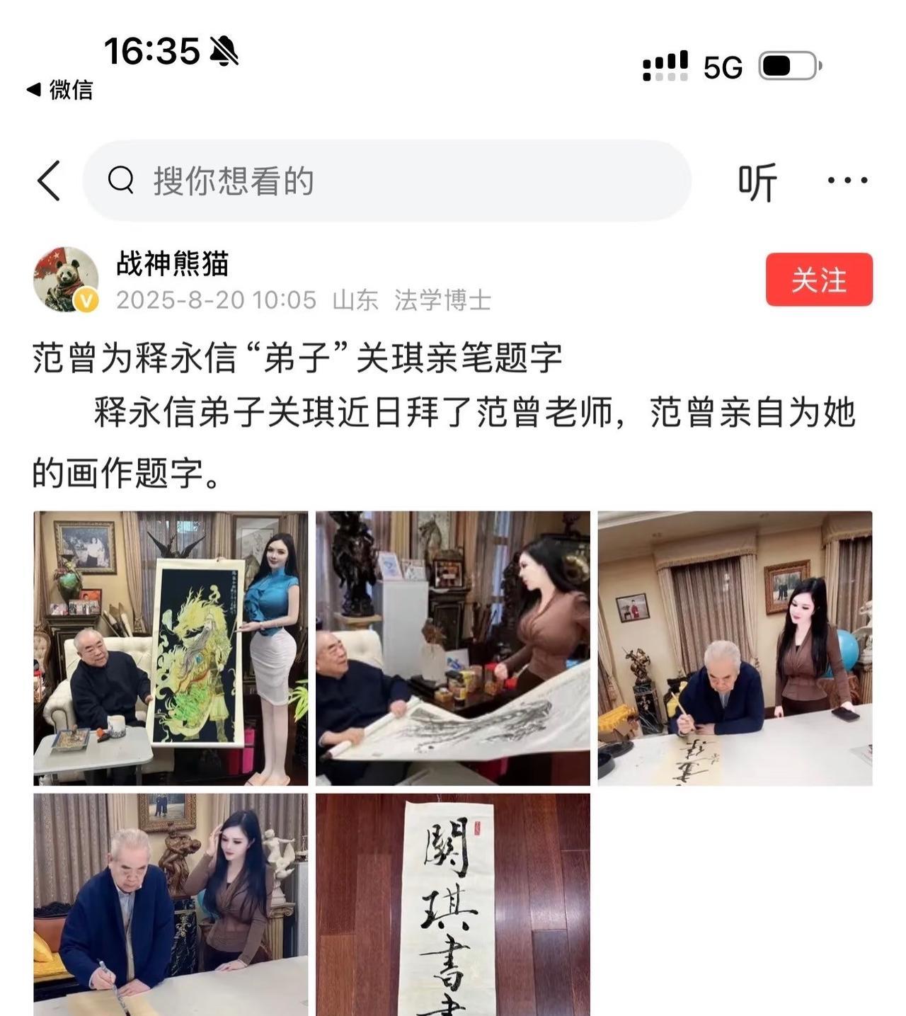 这位美女太懂得流量了,[发怒][发怒] 前不久,看到送画给释永信, 把大师逗得乐呵呵, 有网友说,从来没见过释永信这么笑过, 感觉释永信比主持春晚还开心 这次,又去到全网关注的范曾家里, 送上自己的大作, 范曾也是感到非常高兴, 还弯腰亲自为她题写关琪书画集[赞][赞] 对于你们比较懂行的朋友, 这位美女画家的作品, 到底画的怎么样? #晒图笔记大赛# #万能生活指南#
