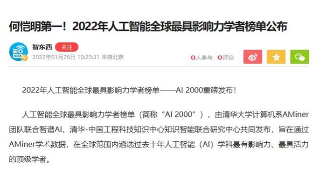2022年,何恺明成为AI领域当之无愧的标志性人物,位列2022年人工智能全球最具影响力学者榜单。