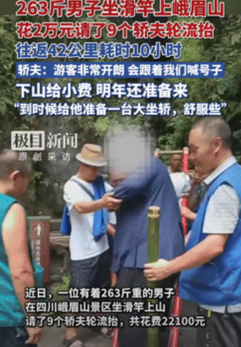有钱就是任性!四川,一263斤男子想爬峨眉山,可又嫌自己爬太累,于是灵机一动,花2万请了9个轿夫抬自己,往返42公里耗时10个小时,在下山时还多给了消费,而男子接下来的一番话,则让轿夫们更高兴了! 据极目新闻8月21日的报道,男子本想着是到峨眉山上的财神殿,拜一下财神,可因为身体不太方便,自己爬不仅又累,可能还完不成。 直到他在山下看到有轿夫时,他就想到了解决办法,那就是请轿夫来,把自己给抬到山上去。 就这样,他以2万元的价格,找了9个轿夫,因为轿子只能同时4个人抬,所以就需要轮流换着来,这样轿夫们也能轻松些,剩下的则去前面引路,要是谁扛不住,再让他顶上。 虽然整个行程总共有42公里,这一路扛下来也累到不行,但这几位轿夫还是挺开心的,毕竟这种大单子,几年都不能一定能碰到一次。 像他们平时遇到的游客,都是出于稀奇体验一下,选择都是3公里480元的项目,而男子这一出手就是2万,算下来每个人都能拿2千多。 而在返程下山的时候,男子还给他们9个,每人1百块的小费,虽说山上有财神,但此时此刻,男子就是轿夫们的真“财神”。 随后男子也说了,等到明年的时候,他还会再过来,轿夫也承诺,会专门给他准备个更舒服的轿子。 那么对于这件事情,您有什么想说的呢?
