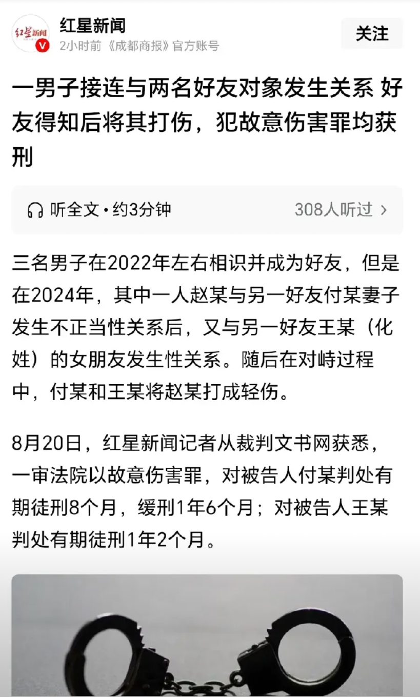 朋友妻不可欺!甘肃陇南,男子和朋友甲的妻子发生关系后,还恬不知耻的告诉朋友乙,后来又与朋友乙的女朋友发生关系,不小心被乙得知。甲和乙气愤不已,找男子对峙过程中,出手将其打成轻伤一级,还为此双双获刑。