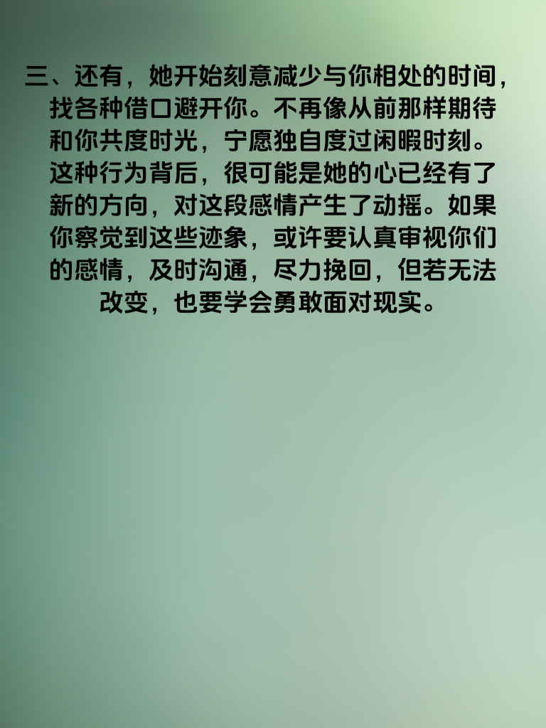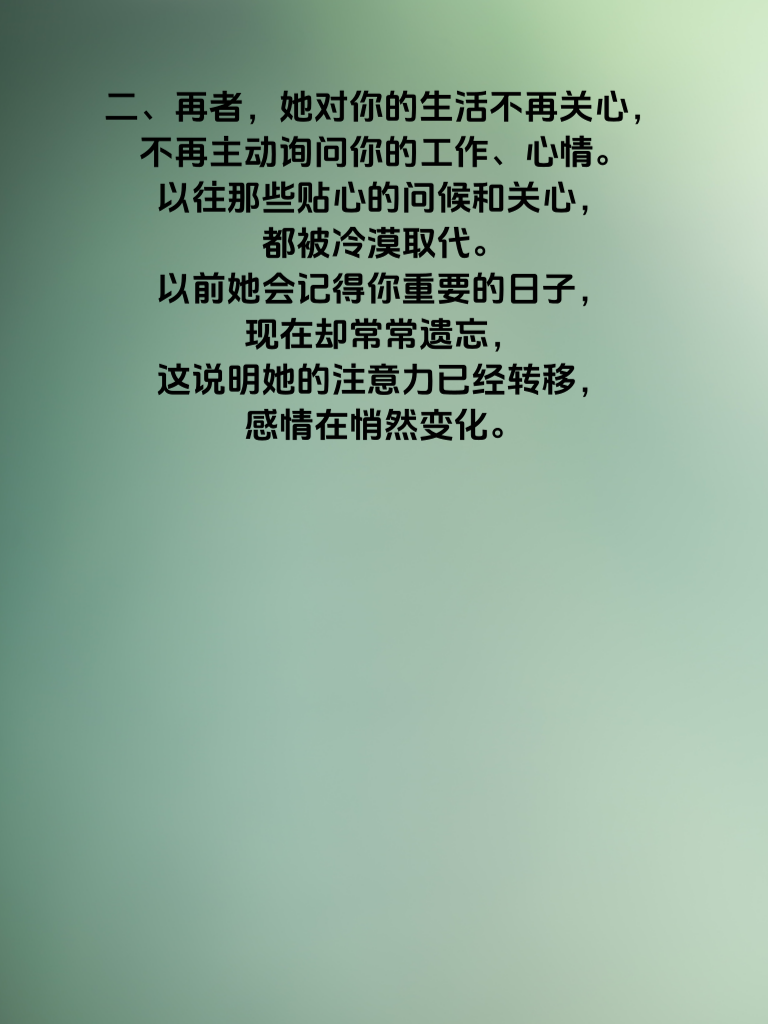 一、女人的情感世界,有时如细腻的丝线,暗藏着不易察觉的变化。当她开始频繁地对你表现出不耐烦,曾经的温柔耐心消失不见,这可能就是变心的预警信号之一。比如,你兴高采烈地分享趣事,她却只是敷衍回应,甚至流露出厌烦,这往往意味着她的心思已不在你身上。 二、再者,她对你的生活不再关心,不再主动询问你的工作、心情。以往那些贴心的问候和关心,都被冷漠取代。以前她会记得你重要的日子,现在却常常遗忘,这说明她的注意力已经转移,感情在悄然变化。 三、还有,她开始刻意减少与你相处的时间,找各种借口避开你。不再像从前那样期待和你共度时光,宁愿独自度过闲暇时刻。这种行为背后,很可能是她的心已经有了新的方向,对这段感情产生了动摇。如果你察觉到这些迹象,或许要认真审视你们的感情,及时沟通,尽力挽回,但若无法改变,也要学会勇敢面对现实。