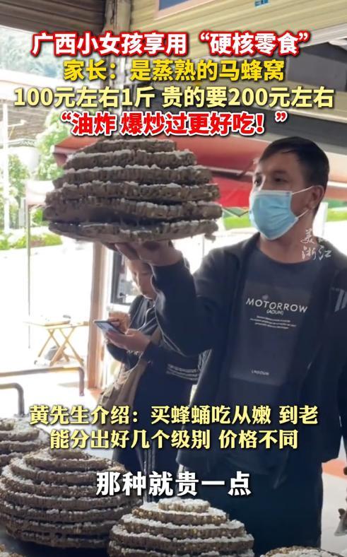 “还是广西老表会吃!”8月20日,广西,一男子买了份蒸熟的马蜂窝,带回家后,女儿