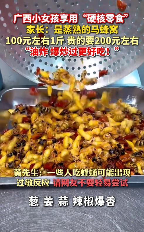 “还是广西老表会吃!”8月20日,广西,一男子买了份蒸熟的马蜂窝,带回家后,女儿直接拿牙签扎着吃!本以为女孩接受不了会吐出来,没想到,女孩吃完后,竟瞪大了双眼,表示还想继续吃。网友:小时候都是直接生吃的! 马蜂是一种会蜇人的昆虫,人们在遇到后都会避而远之,但殊不知它的幼虫——蜂蛹,却是难得的美食。在两广地区,不少人都是直接生吃的,用葱姜蒜爆炒后堪称人间美味! 这天,黄先生在路边看到有人在卖蒸蜂蛹,于是就挑选了一盘带回家,别看只是简单的给蒸熟了,但是售价可一点也不便宜,市场价在100元左右一斤。 黄先生将蜂蛹带回家后,女儿直接跑了过来,拿起牙签就开始品尝这来之不易的美味!尝试过后露出享受的表情。 有网友担心,这样不会吃到粪便吗?其实蜂蛹在不断发育的过程中,尤其是快变成成蜂的时候,体内的粪便就很少了,但是售价也会相对高一点。 不过这道美食也不是谁都能吃的,那些蛋白质过敏的人群就没有这种口福了。 网友看后表示,果然还是广西老表懂得享受,很多人看到虫子都觉得恶心,根本没有勇气去尝试,真是佩服! 大家对于这件事是怎么看? 信息来源:《小女孩享用硬核零食竟是蒸熟的马蜂窝家长:油炸、爆炒后更好吃。》美丽浙江