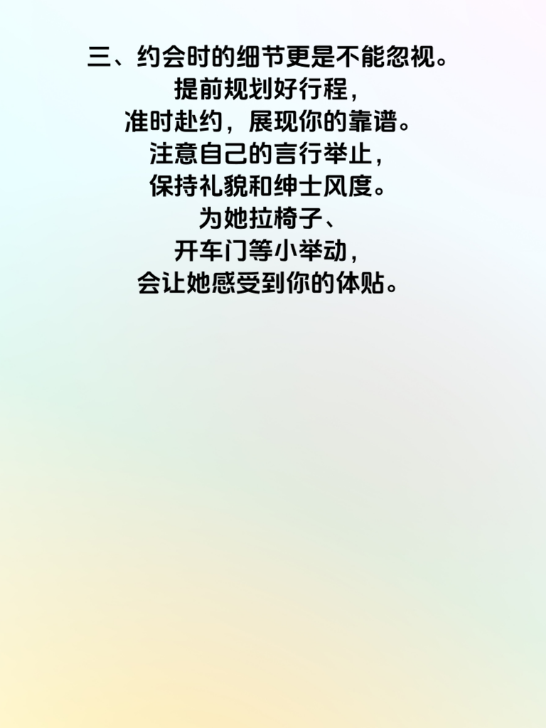 一、追求女生时,细节往往决定成败。首先,记住她的喜好是关键加分项。比如她喜欢的颜色、食物、电影类型等。当你能不经意间送上她心仪的小礼物,或者约她去看她期待已久的电影,她会感受到你对她的用心,好感度自然飙升。 二、注重聊天细节也很重要。回复她的消息要及时,让她知道你时刻在关注她。聊天时多倾听她的想法,不要急于表达自己,适当给予肯定和鼓励,让她觉得和你交流很愉快,很被尊重。 三、约会时的细节更是不能忽视。提前规划好行程,准时赴约,展现你的靠谱。注意自己的言行举止,保持礼貌和绅士风度。为她拉椅子、开车门等小举动,会让她感受到你的体贴。 四、还有一点,记得在特殊日子给她惊喜。生日、纪念日等,精心准备一份礼物或者安排一个特别的约会。这份用心会让她觉得自己在你心中无比重要,从而增进你们之间的感情。做到这些加分细节,相信你追求女生的成功率会大大提高。
