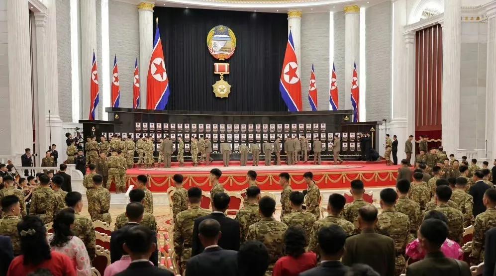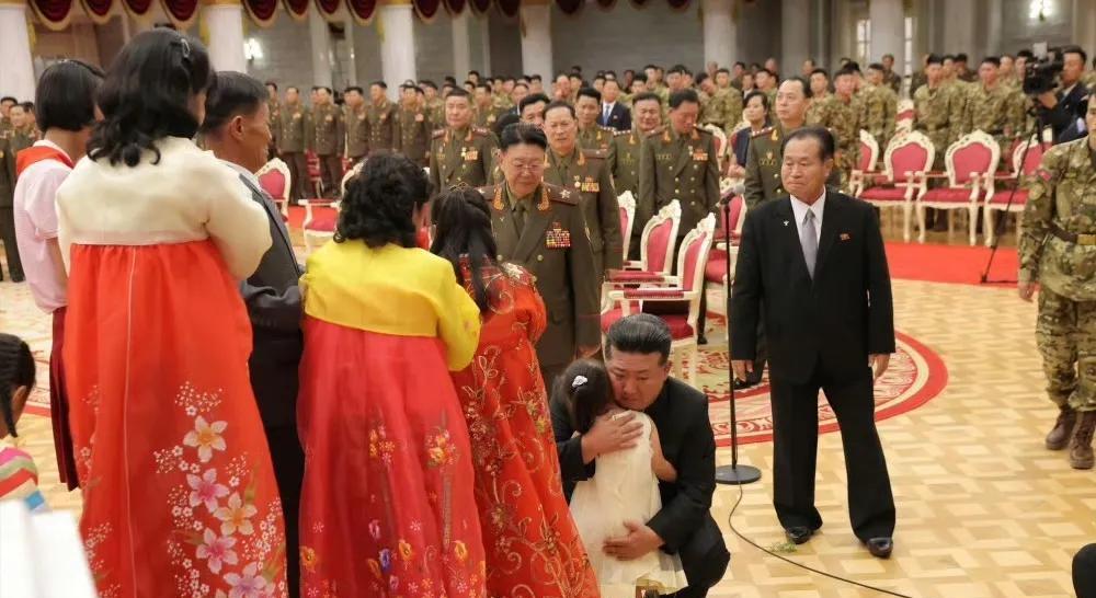 朝鲜举行国家授勋仪式,为海外作战指战员代表及烈士授勋,万万没想到,朝鲜会把牺牲烈士照片摆到主席台上,大约有100位烈士。 朝鲜领导人金正恩跪下来亲自为烈士颁发奖章,和烈士家属拥抱,授勋士兵和家属多次拥抱。