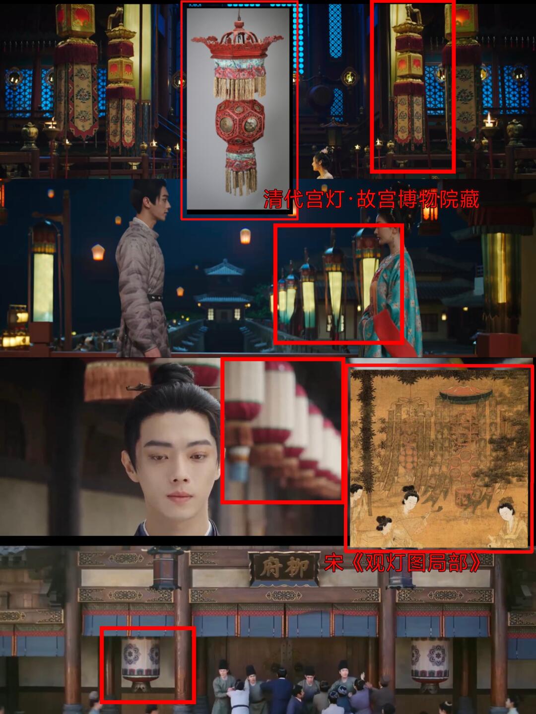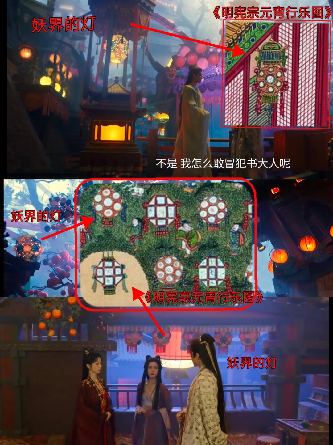 ❗❗子夜归所展示的灯的种类太多了,看得我是目不暇接, ❗❗也终于体会到了古诗中所写的“东风夜放花千树”的实景感。 ❓都有那些种类呢? 1⃣️烛台:梅竹雨书桌上出现过。 2⃣️树形连枝灯:在如意楼、武祯房、常曦宫、皇宫里都出现过。 3⃣️各式花灯: 妖界悬挂的花灯原型来自于《明宪宗元宵行乐图》。 4⃣️传统宫灯:柳尚书、梅逐雨以及天灯节街上所挂的灯笼都是传统宫灯,以木架为结构,外面镶嵌纱等。 5⃣️就连天灯也不是敷衍的白色,都是稳稳地扎了木质骨架,外面的布也画上了与背景相同的纹样。 ❗❗各种样式的灯被点亮时,我突然想到了宋人写的诗: 🏮玉照梅开,三百树、香云同色。 🏮光摇动、一川银浪,九霄珂月。 ❗❗真的是一派万灯璀璨,盛世如华的繁荣景象!