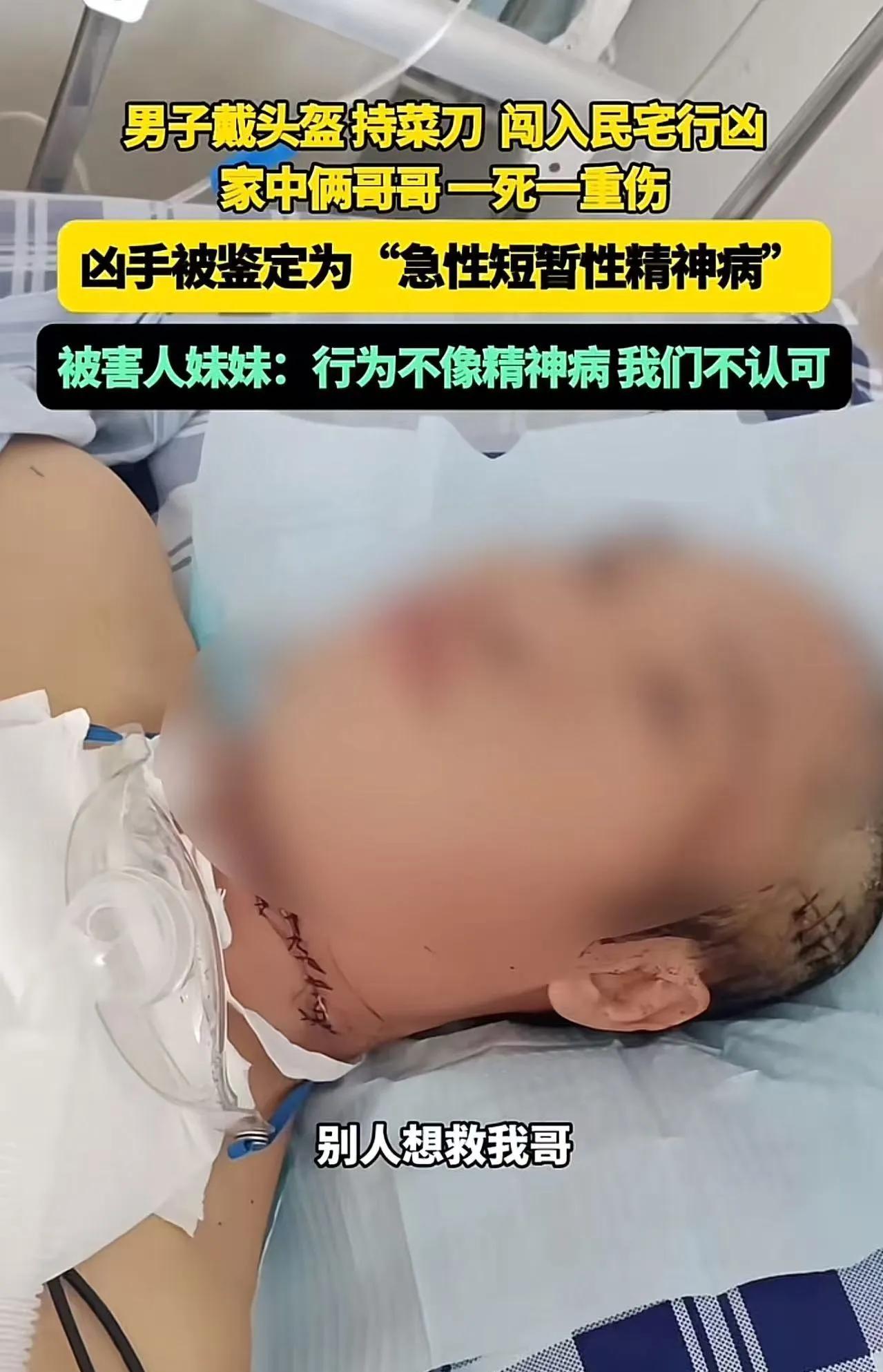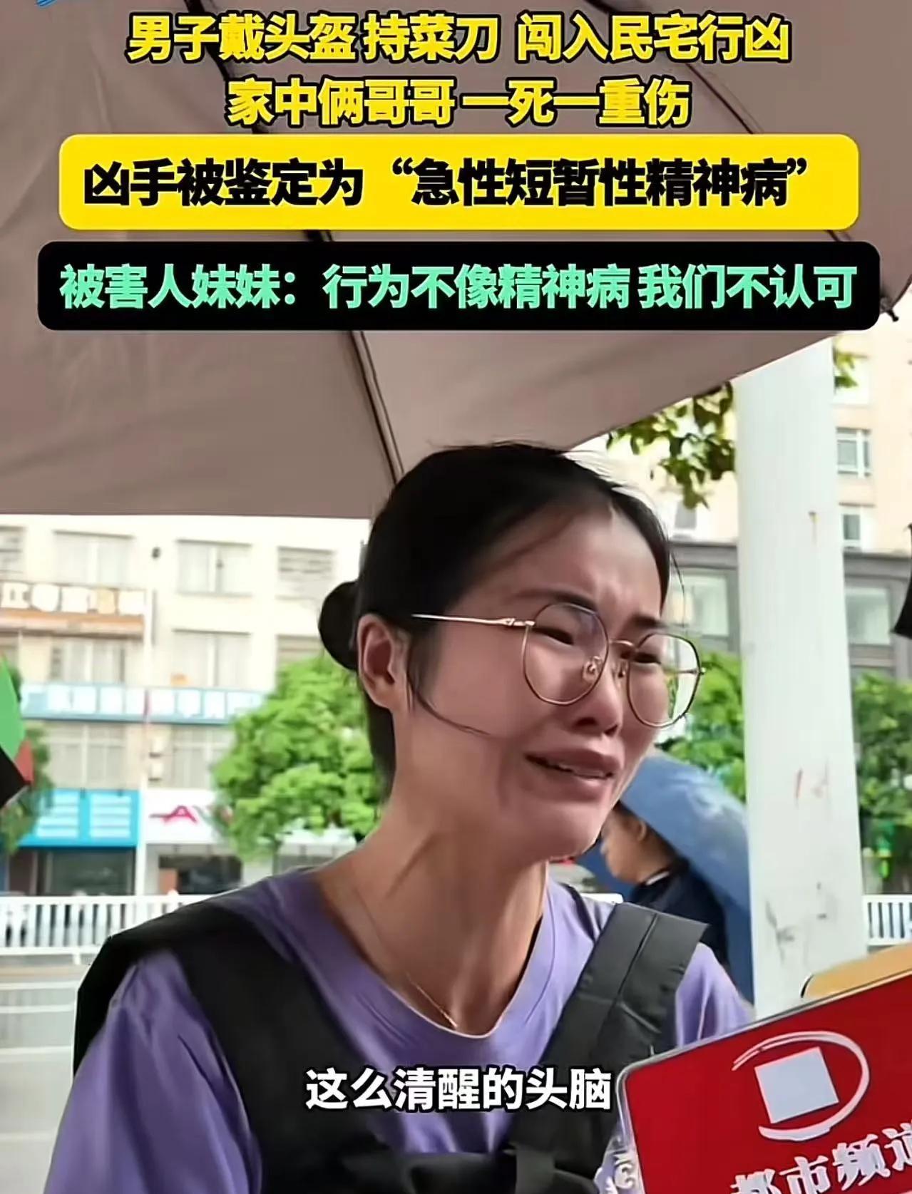 “哪来的精神病,我们不认可!”广东廉江,男子戴头盔持菜刀闯入民宅行凶,家中俩哥哥一死一重伤。妹妹:“凶手被鉴定为短暂性精神病,可他的行为根本不像精神病,希望严惩凶手!” (来源:都市报道) 受害者的妹妹,哭着跟记者讲述事发当天的情况。那天中午,堂哥堂嫂也在家里玩。 但凶手看人多没有动手,等到下午2点钟,堂哥堂嫂离开后,凶手才开始戴着头盔,穿着厚衣服,拿出一把崭新的菜刀,跑到家里对两个哥哥行凶的。 妹妹说:“我哥跑出去外面两三百米,他还紧追着。然后我哥没跑过,就当场被砍倒了。围观的人说,两个都已经倒下了,已经不能动了,他还在继续砍,砍完这个砍那个。别人想要救我哥,他就阻止别人,不让别人救我哥,这么清醒的头脑,还知道自我保护,哪来的精神病啊!” 此事引发了热议,有网友说,有准备和防预的杀人,还叫间歇性精神疾病?从行为看,就是故意的,为什么这么多人围观,只对着目标砍?精神病应该是胡乱砍人! 也有网友说,即使真是精神病,但这种会杀人的精神病留在世上对社会危害更大,所以,对于杀人犯来说,不管是不是精神病都应抵命。 还有网友说,现在国内有一些人借口精神病杀人,想以此躲避死刑!因为我国法律规定,精神病发病犯罪,可以免除刑事处罚。 我觉得,精神病人能走入社会,就证明他是正常的,必须承担法律责任。否则就不应该走入社会。权利和义务必须对等! 其实精神病人要区别对待:1,没有暴力倾向的精神病人可以善待!2,对有暴力倾向的精神病人,对人类生命财产有威胁或潜在威胁的精神病人,可以判终身囚禁,因为这个是对真假精神病的唯一治疗方案 有暴力倾向的精神病患者对人类的威胁巨大,而且有些有钱有势的犯罪分子通过假冒精神病患者逃过惩罚! 另外,精神病鉴定机构的责任必须要明确,如果一旦确定鉴定机构作假,那就得按同案犯处理,与嫌疑人同罪。 不论年龄,不论健康与否,只要有故意,有能力伤人就要承担刑事责任,幼儿犯错可以原谅,过失犯罪可从轻,其它犯罪必须依法惩处!#头号创作者激励计划#