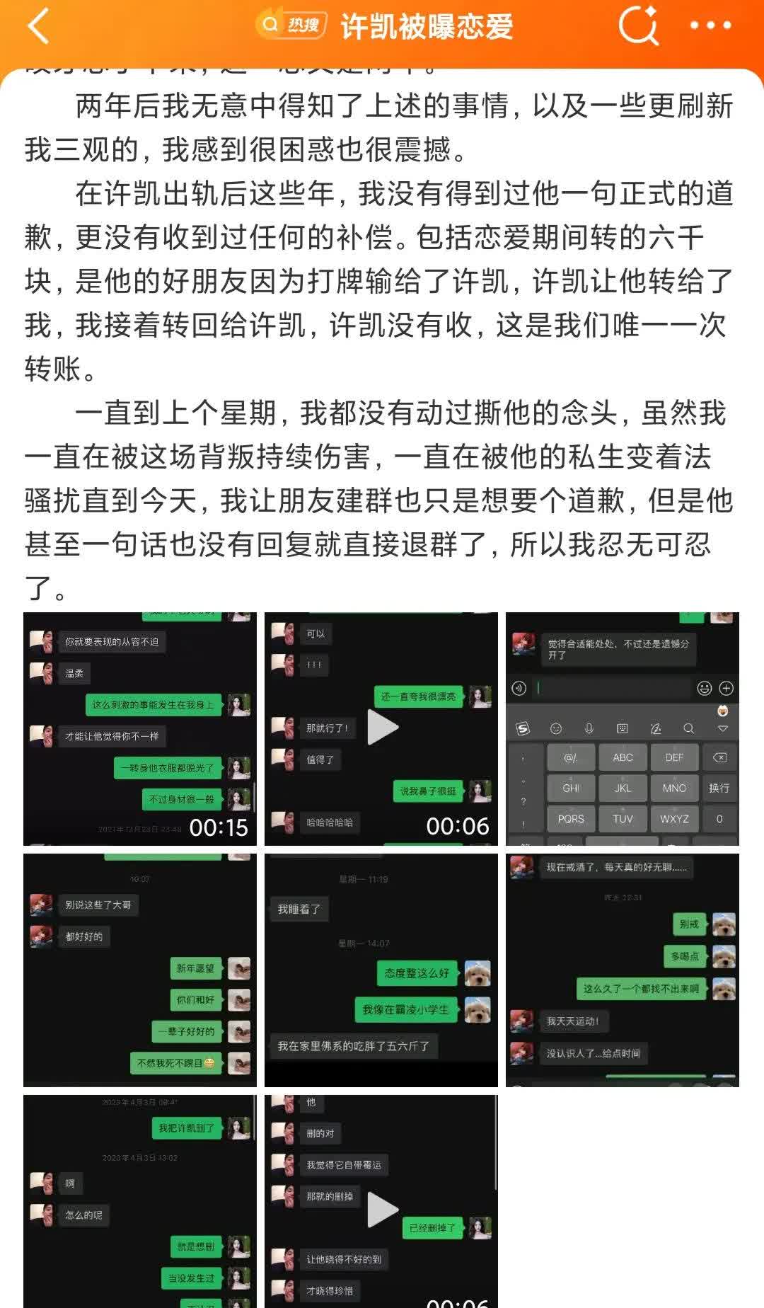 许凯形象大崩塌, 许荔莎再曝猛料,许凯第二次见面就借着酒劲亲她,而且还一边亲一边脱衣服。 亲完后转天又不停的联系许荔莎,给她送礼物,解释自己喝多了。 之后就是两人交往和许凯劈腿,许荔莎写的很是详细,然后附上各种聊天记录。 让我感到吃惊的事情是,许荔莎和朋友吐槽了这件事,并评价许凯,身材很一般。 不得不说,许荔莎这个爆料算得上有图有真相,应该够许凯喝一壶的了。