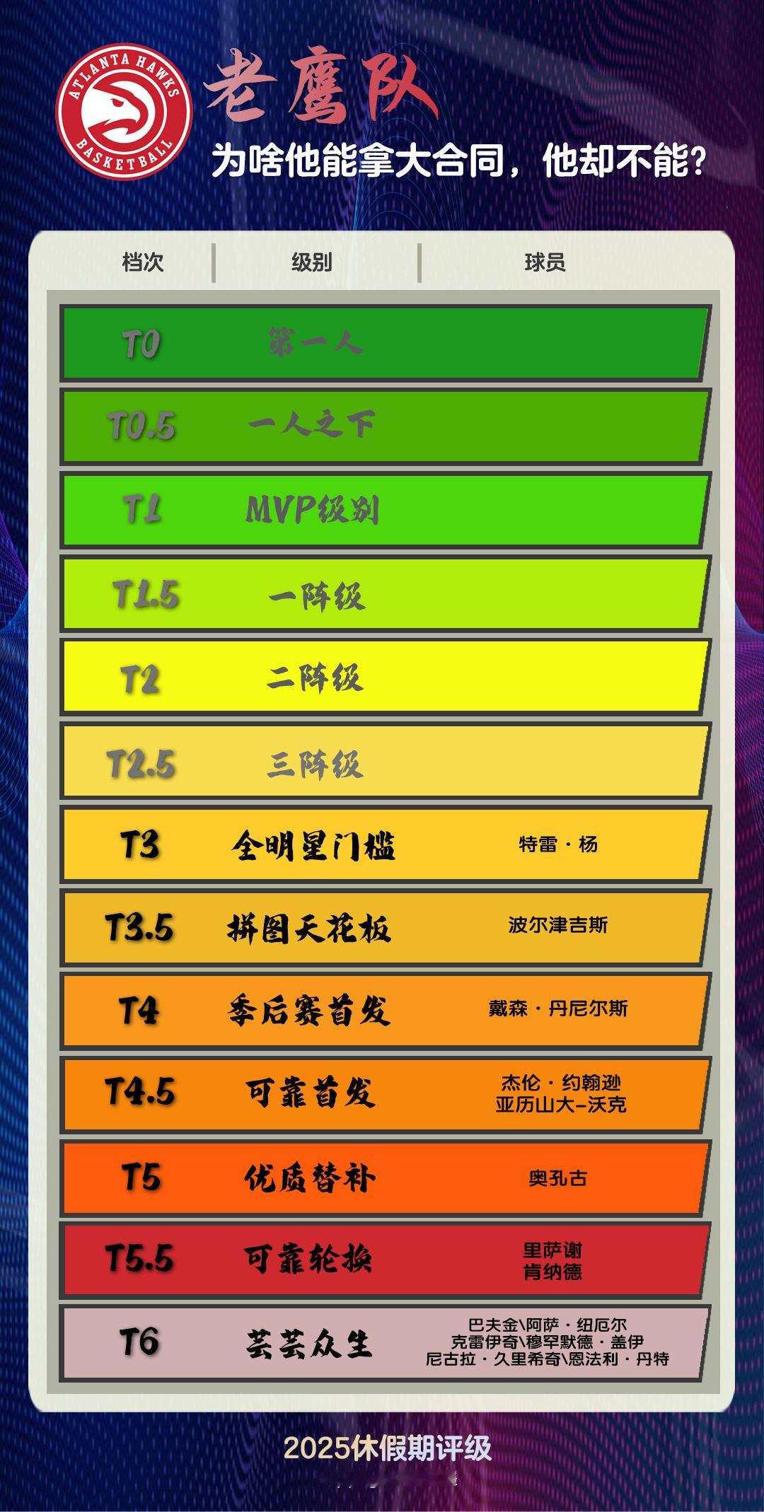 总的来说,我会喜欢老鹰的建队骨架,但伤病隐患、替补阵容的结构性问题明显,对于他们是否会起飞,还是只能给出最猥琐的态度——“谨慎乐观”。东部有那么两支不知道存在意义的球队垫底,还有摆明要躺的公牛,以及大概率不会认真的凯尔特人。往上看,骑士、尼克斯是大佬,魔术应该有点东西,费城不至于连拉两年,雄鹿毕竟有字母,残阵步行者也不宜低估。