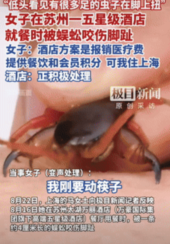 够吓人的!江苏苏州,一女子在5星级酒店吃饭时,脚趾突然传来一阵刺痛,低头看去,竟发现是有条蜈蚣咬到了自己,随后被朋友送到了医院,经过治疗已无大碍,于是她就找到酒店要说法,不料,对方的态度,却让女子接受不了! 据极目新闻8月22日的报道,这件事情发生在苏州,女子和几个朋友过来游玩,吃饭时选了家5星级酒店。 当点的菜品都上齐后,大家便准备动筷子了,可就在这个时候,女子突然觉得脚趾很疼,像是被什么东西给咬了。 随后她立即低头望去,结果发现有条蜈蚣,正趴在自己的脚上,吓得她直接叫了出来,服务员听到后,便过来处理,把蜈蚣给弄死了。 可没过没久,女子的脚就肿了起来,于是朋友急忙送她去医院,经过治疗之后,情况好了不少,如今已经痊愈了。 事后,她就找到酒店方讨要说法,但对方给出的解决方案,就是承担治病的钱,给一些会员积分,以及可以再过去免费吃一次饭。 而对于这些,女子没办法接受,毕竟她家是在上海的,又不经常来苏州,所以酒店的补偿没啥太大的意义。 于是她就找到媒体寻求帮助,然后酒店也给记者做出了答复,先说事情只是个例,接着又说已经给女子进行了道歉,而关于赔偿的事情,还在协商处理当中。 那么对于这件事情,您有什么想说的呢?