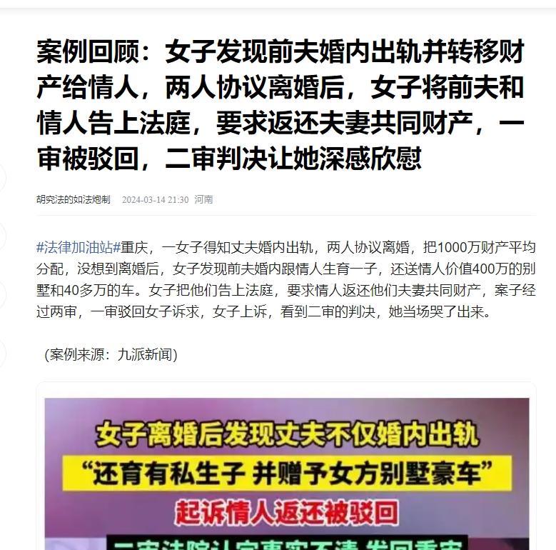 事出反常必有妖!”重庆,丈夫出轨,女子和平离婚分得500万。不久后,女子意外得知前夫给情人购置过400多万的联排别墅和40万豪车。女子将前夫和情人告上法院归还财产,但一审败诉了。女子不服上诉,二审判决令人意外。 在重庆这个地方,总有些婚姻故事让人觉得蹊跷。丈夫出轨后,妻子拿到500万就离婚了,本以为就这么结束了,谁知后来爆出前夫婚内给情人买了400多万别墅和40万豪车。这事一出,妻子直接告上法庭,一审输了,二审结果却让人猜不透,财产到底能不能要回来? 这个故事里的谢金梅和古言中,都是重庆本地人。谢金梅二十岁时通过介绍认识古言中,那时候古言中就是个开大货车的司机,拉货挣钱养家。两人结婚后,谢金梅帮着丈夫一起打拼,古言中后来自己开公司,做劳务生意,承接建筑项目,逐步把家底攒到千万级别。谢金梅生了儿女,管着家里的事,古言中在外头忙生意。 公司注册在2015年6月,项目覆盖重庆、新疆、贵州等地。古言中在行业里信誉不错,签合同顺利,但外债也有一些。谢金梅主要在家带孩子,偶尔去公司帮忙记账。生活看起来稳当,孩子上学,家庭开销不成问题。古言中继续扩展业务,雇人管调度,谢金梅逐步完全退到幕后。话说回来,男人事业起来了,往往就容易出点事,古言中也没例外,后来圈子里传他外头有人,还生了孩子。谢金梅起初不信,但传的人多了,她就问了,古言中承认了。 十五年婚姻就这样裂了,谢金梅要求离婚,古言中同意,分给她500万,还每月给孩子抚养费。离婚在2020年9月渝北区民政局办的,手续简单。谢金梅带孩子过日子,几个月后从朋友那知道,古言中婚内给情人买了联排别墅,四百多万,在梁江新区,还有一辆奔驰车,首付十二万,全在2019年买的。情人生了个儿子,古言中出的钱,但情人没经济来源。谢金梅气不过,找律师周立太收集证据,银行流水、房产登记全证明是婚内财产。依据民法典1092条,隐藏财产可以要求重新分。她起诉到渝北区法院,要前夫和情人返还财产。 古言中辩称是项目资金,不是赠与,情人参与生意。法院一审在2023年5月驳回,说证据不足证明赠与协议。谢金梅上诉到重庆第一中级法院,二审认为事实不清,购房购车转款需查明,2023年10月发回重审。案件回到渝北区法院,等着新审理。谢金梅继续带孩子,古言中管公司,情人还用着那些财产。 法律上,夫妻共同财产包括生产经营收益,古言中公司挣的钱算共同的,他转给情人算隐藏。民法典1062条规定,夫妻对共同财产平等处理权,但不能挥霍或转移。谢金梅证据有房产证复印、转账记录,足够证明出资来源。古言中说项目往来,但没具体合同证明。法院一审没支持,是因为诉求不明确,没举证赠与协议。但二审纠正了,要求查实资金流向。这案子典型,反映离婚后财产纠纷常见问题。很多人离婚时没查清财产,就吃亏了。谢金梅坚持上诉,体现了维权意识。古言中出轨转移财产,这种行为在法律上不占理,但一审败诉说明证据链得严谨。重审可能要调银行记录、出生证明,但之前律师申请调查令没准。 类似案子,法院常根据事实重新分财产,给隐藏一方少分或不分。重庆渝北区法院处理过不少离婚案,这件发回重审,说明上级法院重视事实认定。谢金梅离婚分得500万,本是协议,但发现隐藏财产后,能追回部分。别墅十六点零八平方米,车子四十万级别,全是共同财产。古言中公司运转正常,外债不影响,但转移行为损害谢金梅权益。 情人无收入,财产明显不合理。法律保护弱势一方,谢金梅作为原配,有权要回。话说这种事,生活中不少见,丈夫有钱就变卦,妻子得留心财产。古言中当初从司机起步,靠夫妻共同努力致富,现在却这样处理,太不地道。谢金梅不服输,上诉坚持,值得学。案件悬而未决,重审结果会怎样,得看新证据。民法典实施后,这种纠纷判决更公平,强调财产透明。古言中辩护弱,项目资金说不过去。 谢金梅收集证据花时间,但必要。重庆第一中级法院判决书强调调查取证,体现了司法严谨。谢金梅生活没停,孩子上学照旧。古言中生意继续,情人房产在手。重审后,可能判谢金梅胜诉,返还财产份额。类似案例,法院常支持原配追回。古言中行为算侵占,离婚后还能诉讼。时效两年,从知道隐藏起算,谢金梅及时起诉。律师作用大,周立太帮着整理卷宗。 渝北区法院重审,会再开庭审双方陈述。谢金梅诉求明确,要求确认赠与无效,重新分割。古言中需提供反证,不然难翻盘。案件来源重庆渝北区法院和第一中级法院,真实记录在案。人物化名,但事实不变。婚姻中信任重要,但财产得明晰。古言中出轨事实成立,转移财产加重错误。 这案子二审结果那么意外,你觉得谢金梅能赢吗?欢迎留言说说看法,一起聊聊婚姻财产那些事。