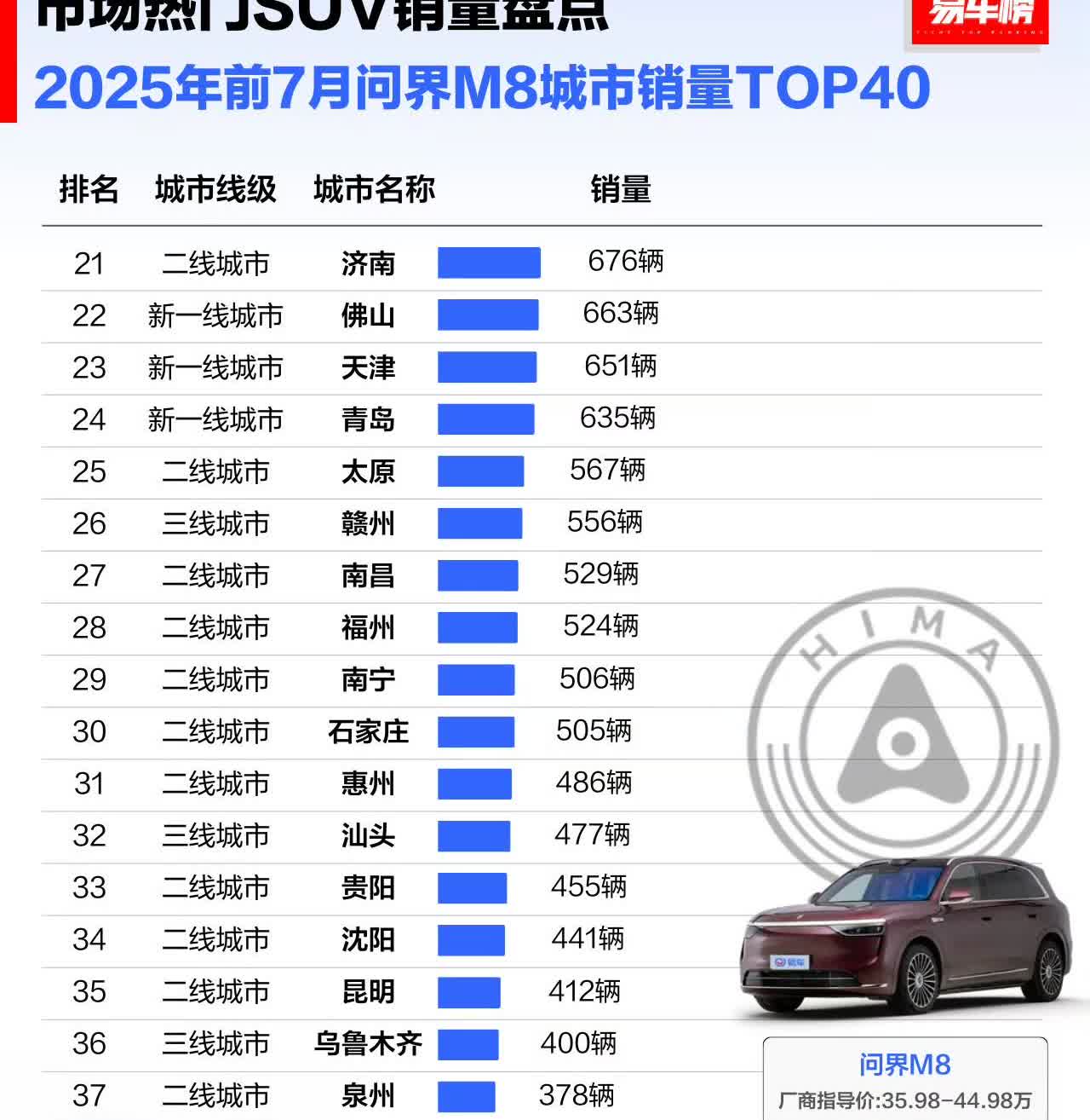 来看看哪些城市的朋友爱买问界M8?(1-7月) 1、深圳 2837辆 2、成都 2681辆 3、广州 2530辆 4、杭州 2103辆 5、重庆 2070辆 问界M8纯电版近期在各大城市巡展,这五个城市得加大展出力度吧[呲牙]