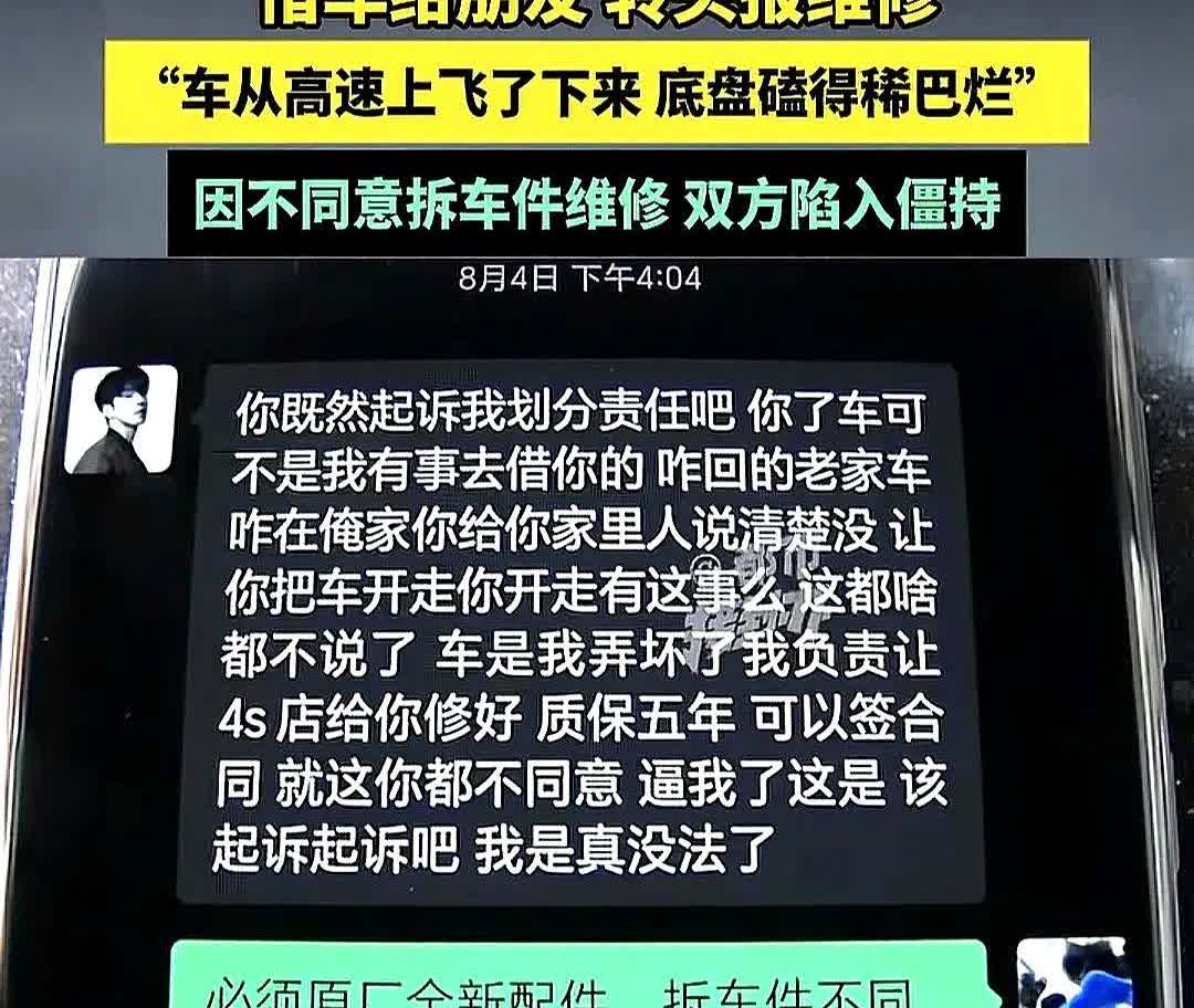 河南安阳,男子把父亲刚买半年的车借给朋友开,不料,朋友开车从高速上飞了下来,底盘磕的稀烂,朋友要用拆车件给男子修车,质保5年,需3万多块钱,男子不同意,让他必须用原厂全新配件,得5万多,万万没想到,朋友干脆玩起了消失。 这朋友之前说得好好的,白纸黑字签了协议,说一定负责到底。 结果一听4S店说用新零件要5万多,立马就变脸了。 非要用3万多的旧零件,把新车的终身保修给弄没了。 人找不到,找到他爸,他爸倒是不急,一边刮胡子一边听着,就是不给个准话。 这哪是朋友,这就是用2万块钱让你看清一个人。 当初胸脯拍得响,现在电话都打不通了。 车是新车,情分可不值钱。 这么一折腾,朋友没得做,还落一肚子气。 以后这车,真是不敢再往外借了。