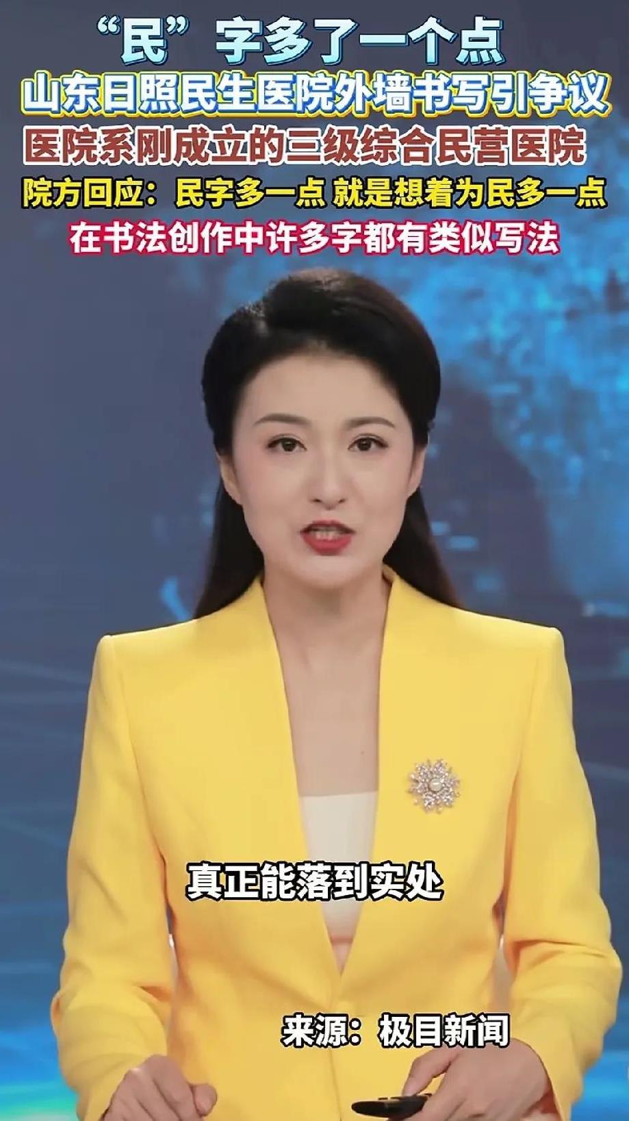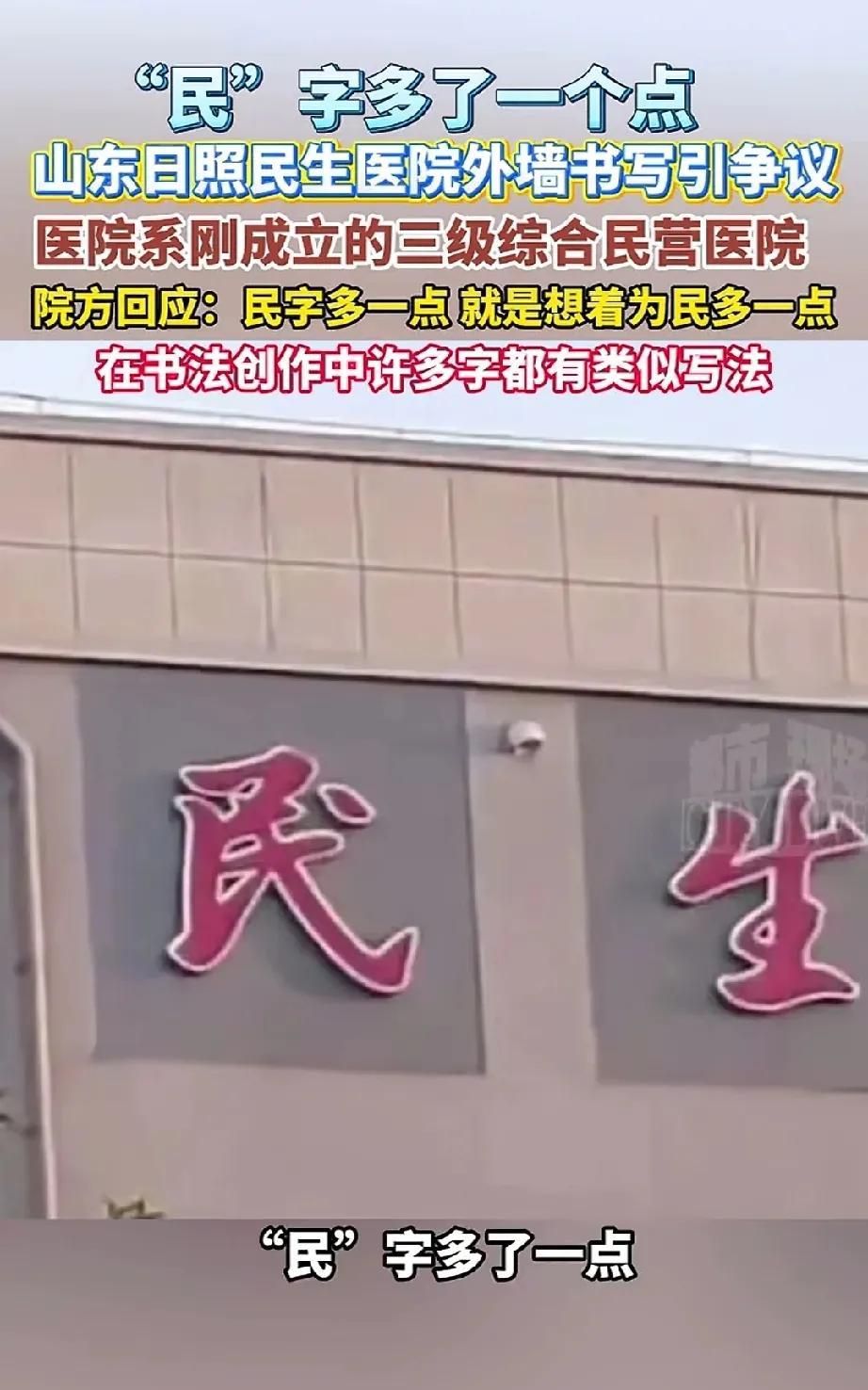 “民”字多一点惹来全网争议,看我怎么“狡辩”? 医院的“民”字系书法家所书,这“民”字多出一点,到底多的是哪一点呢? 牵强的解释,只会沦为老百姓的笑柄。 近日,山东日照民生医院的“民”字写法被老百姓发觉多了一点,而医院给出的解释是,此字为书法家所写,寓意一心扑在民生上,想要为老百姓多做一点事,多为老百姓考虑。 然而广大网友却另有看法,他们表示医院就别狡辩了,莫拿书法说事儿,错了便是错了,你多的那一点是否是老百姓所想的那一点,大家心里都清楚得很。 要是真的为老百姓着想,又怎会纠结于一个字,从而让老百姓议论不休呢?