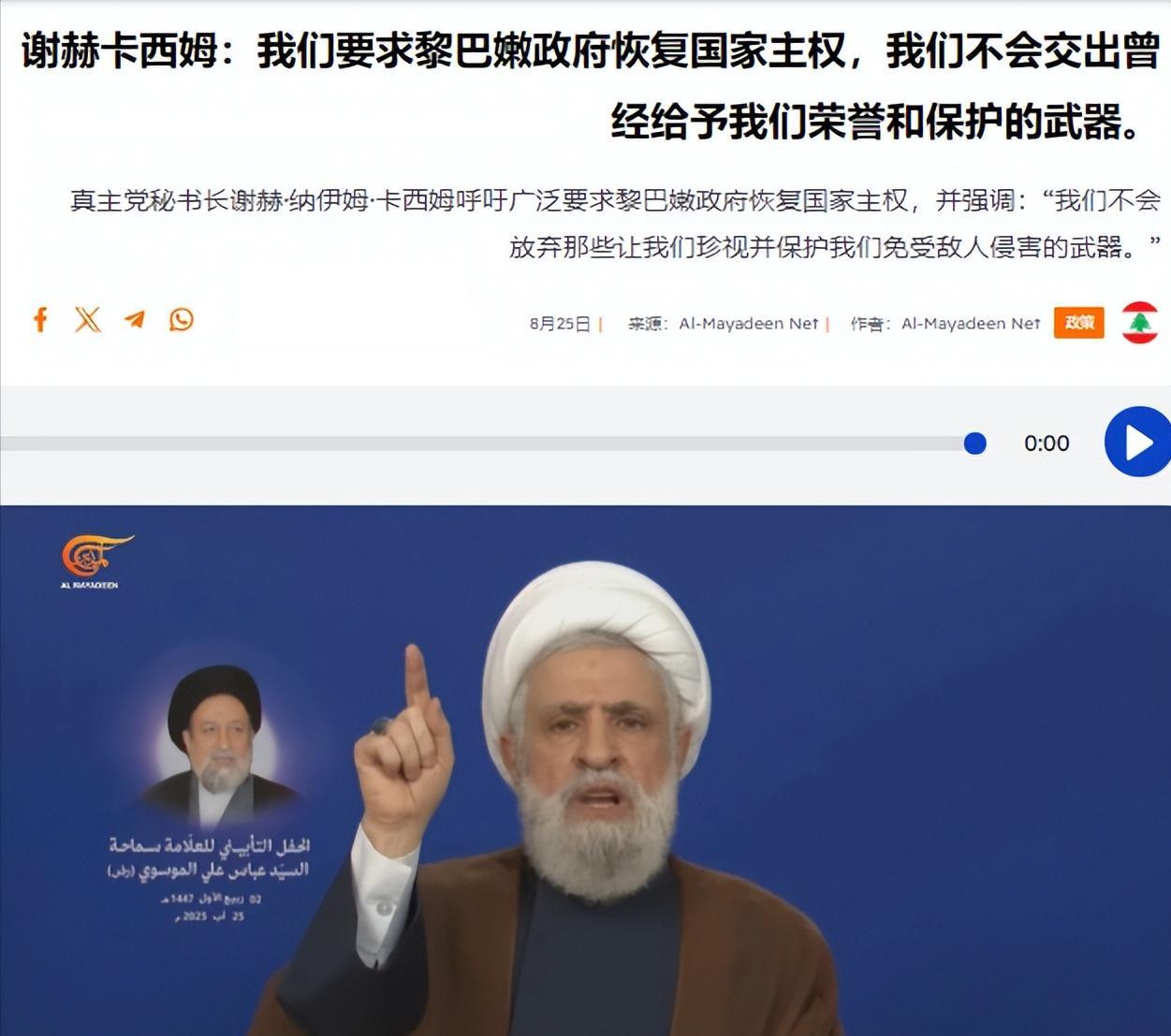谢赫·纳伊姆·卡西姆在昨天的讲话中明确表示,“真主党”拒绝放弃武器,解决黎巴嫩问题的首要任务是恢复黎巴嫩的主权完整,否则一切都是空谈。 #中东局势#