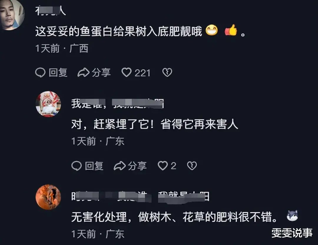 对此,一位广西网友出了个主意,称:“这妥妥的鱼蛋白,给果树入底肥靓哦。”还别说,这位网友的说法相当靠谱,将它们做成肥料,可能是一个两全其美的选择。