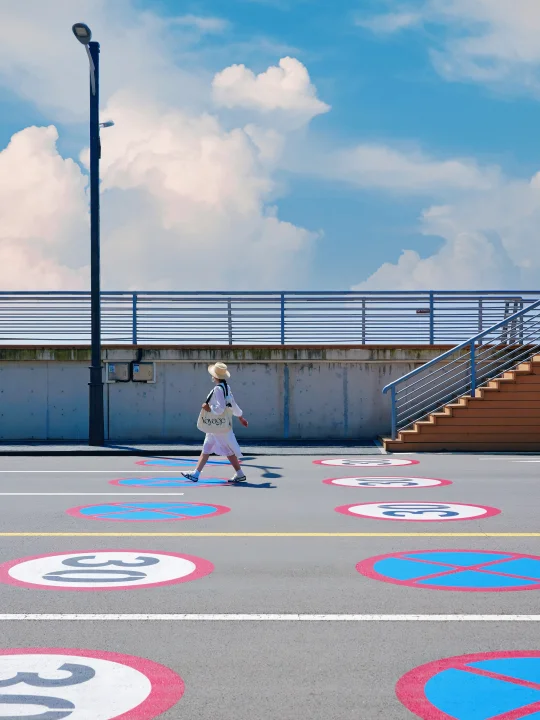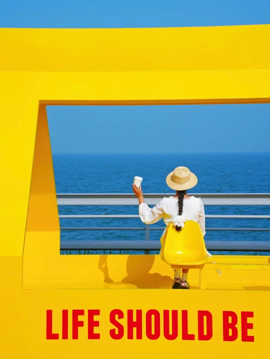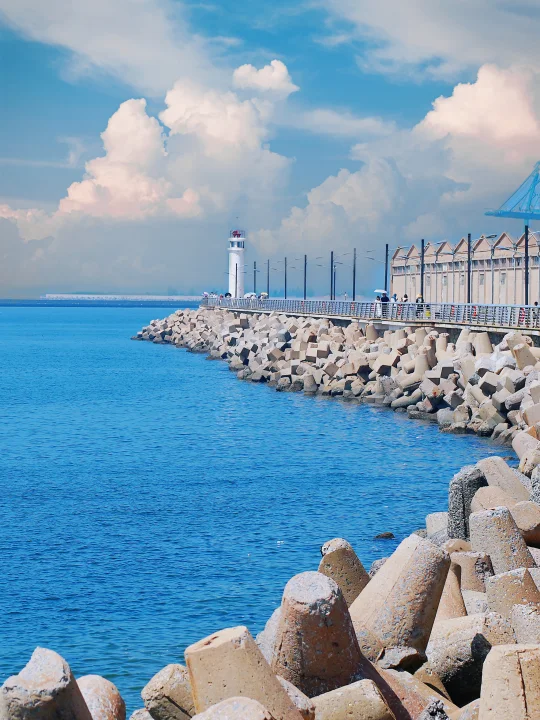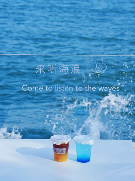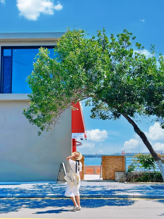沿着海边走有很多特色小店和打卡装置,背景是蔚蓝的大海🌊很适合拍照
