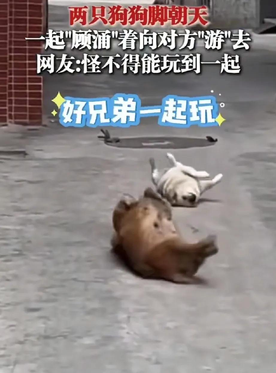 两只狗狗都肚肚朝天,化身为“蛹”,一起像鱼一样“涌动”着游走。 网友们看见了这一